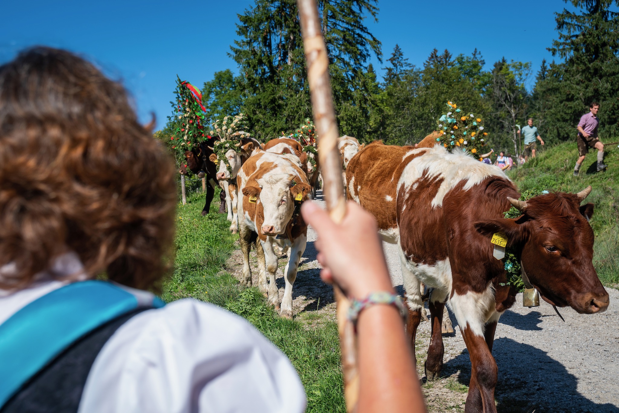 Das Anbringen des Schmucks und der stattlichen Kuhglocken (Schellen) ist eine anstrengende Prozedur, bei der die Almbauern gefordert sind und richtig zupacken müssen. Sind alle Tiere fertig geschmückt, werden sie zusammen getrieben und der eigentliche Abtrieb kann beginnen. Das kann je nach Tagesform der Kühe mal recht lang und zäh, genauso aber auch schnell und für die Treiber durchaus fordernd sein.