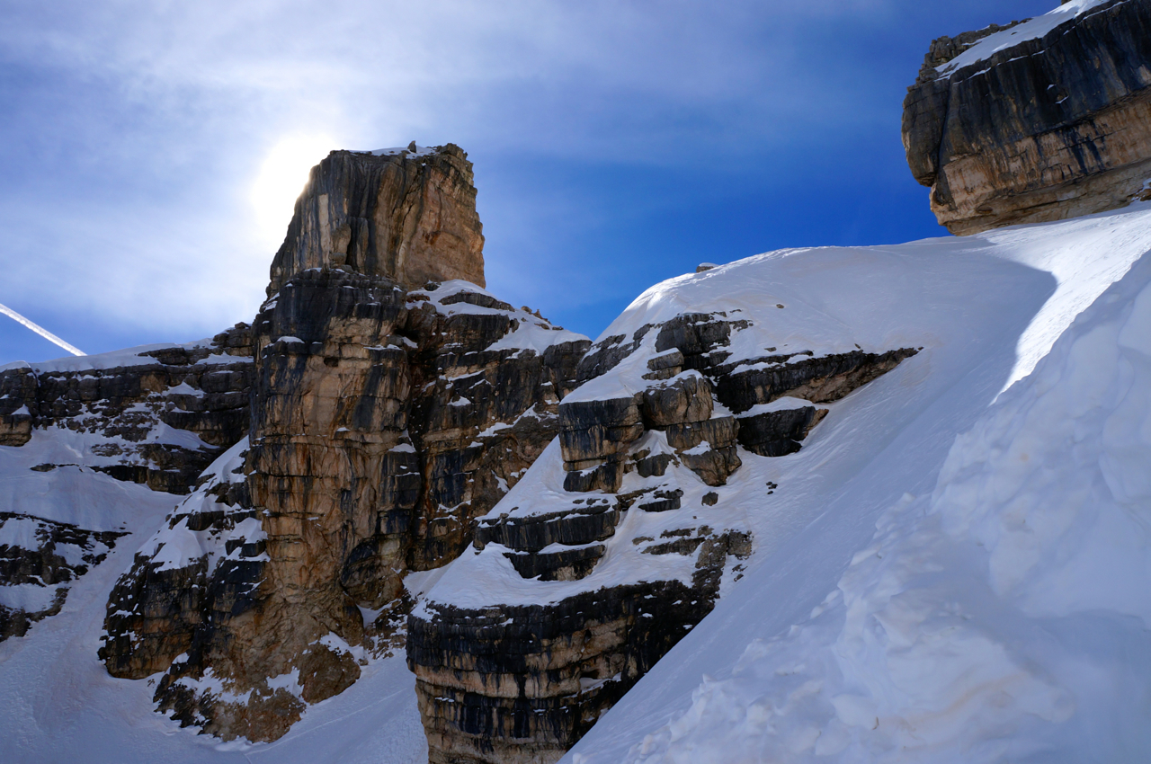 Der zweite Tag der Skido Skisafari führte uns raus aus Südtirol und nach Venetien, welches neuerdings Abspaltungsintentionen von Italien hegt. Im Jahr 1956 war der Ort Austragungsort für die Olympischen Spiele und auch Szenen aus James Bond`s legendärem Skiritt aus “Octopussy” wurden hier gedreht. Und nicht nur das: Im Ersten Weltkrieg wurden in die Felsformationen Labyrinthe von Gängen gesprengt und es wurde erbittert um Felsvorsprünge und Felsbänder gekämpft. Man wandelt und bewegt sich also auf historischen Pfaden.