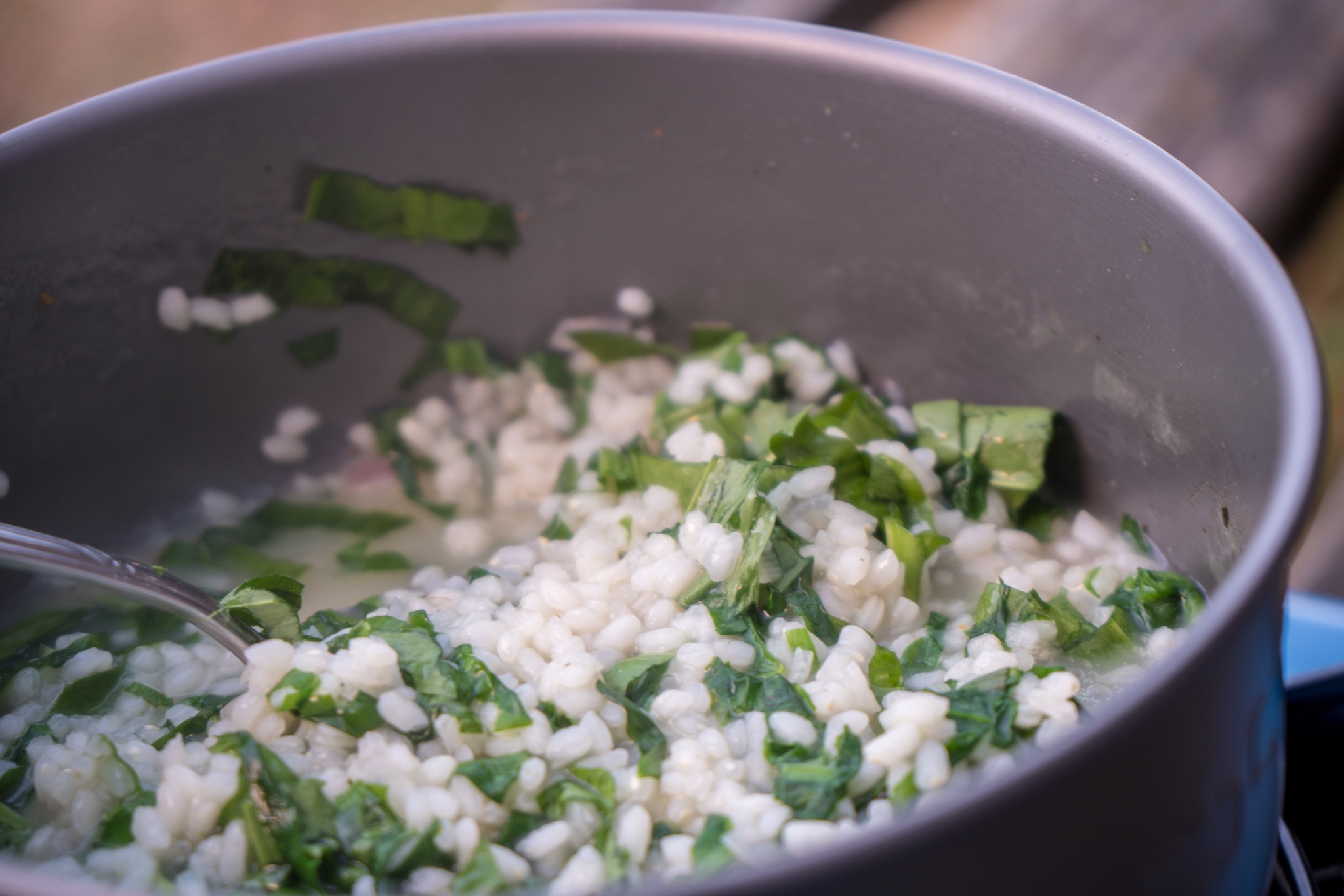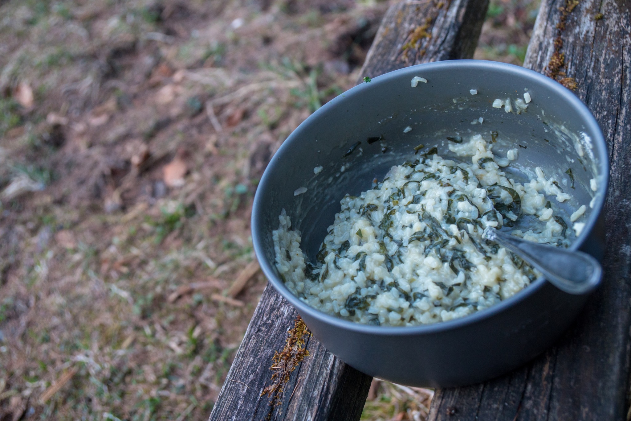 Dabei ist es mit reduzierten Zutaten gar nicht so schwer, auch draußen frisch zu kochen. So wie bei diesem Bärlauch-Risotto. Den Bärlauch findet man mit etwas Glück direkt am Wegesrand, Reis wiegt kaum etwas und Platz für eine Zwiebel, etwas Parmesan und einen Brühwürfel findet man in jedem Rucksack.