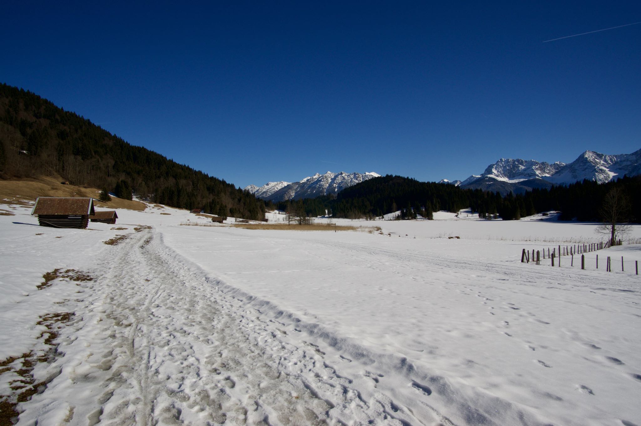 Apropos Fotografen. Von denen trifft man am Geroldsee einige. Tagsüber eher weniger, dafür am frühen Morgen und späten Abend, wenn die blaue Stunde das beste Licht beschert. Der Ausblick ist gigantisch. Wettersteingebirge und Karwendel zeigen sich in ihrer ganzen Urgewalt. Steil abbrechende Felswände, markante Gipfel und legendäre Routen. Eingebettet in eine stille Landschaft aus kleinen Hütten ist der Geroldsee nicht nur ein Paradies für Fotografen. Im Sommer steht bei der Drei-Seen-Wanderung, die neben dem Geroldsee noch dem Barm- und dem Grubsee einen Besuch abstattet, nur ein Sprung zwischen dem schwitzenden Wanderer und der Erfrischung.