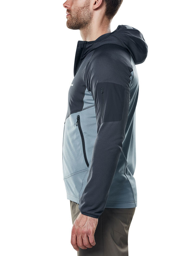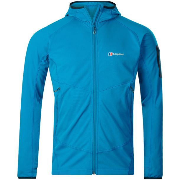 Die Berghaus Pravitale Light Softshelljacke ist mit ihren 360 Gramm extrem leicht. Die Kapuzenjacke besteht aus 100 % Polyester (85 % Polyamid, 15 % Elasthan). Dabei ist das atmungsaktive Material sehr fein gewebt, so dass es sich innen fast wie Fleece anfühlt. Zwei Haupttaschen bieten genug Platz, um das Wichtigste dabei zu haben. In der kleinen Tasche am linken Oberarm findet ein Schlüssel oder ähnliches gut Platz. Handschlaufen an den Ärmelbündchen wärmen die Hände an kalten Morgen.