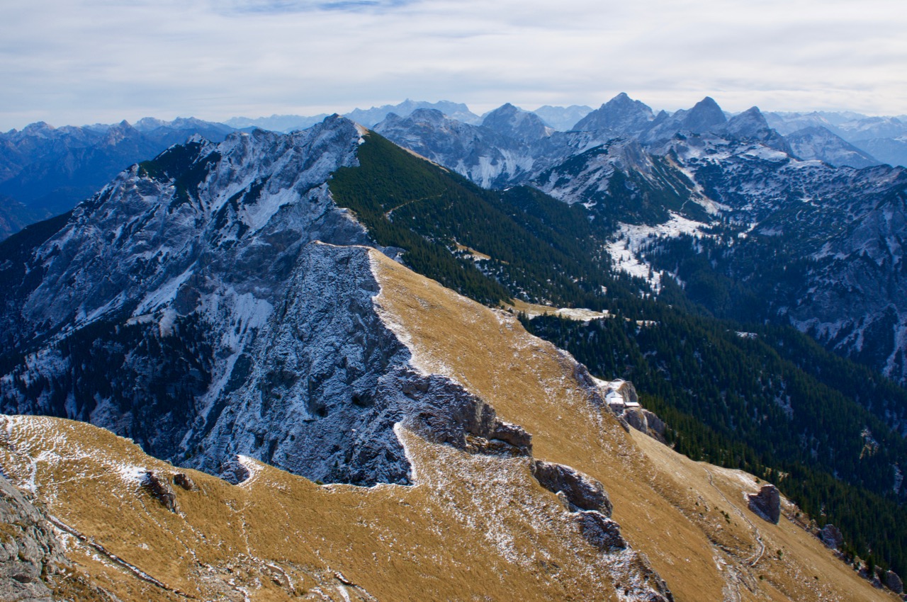 Nach knapp zwei Stunden sind wir schon am Gipfel angekommen und genießen im Windschatten die Aussicht aufs Allgäu, hinüber zu den Ammergauer und den Lechtaler Alpen. Einem kurzen Eintrag ins Gipfelbuch, einer nach der Attacke einer Sturmböe eingesammelten Mütze und einem herzhaften Biss in die Salami später treten wir den Rückzug an.