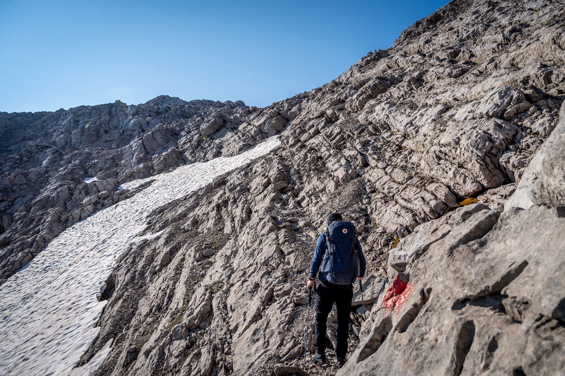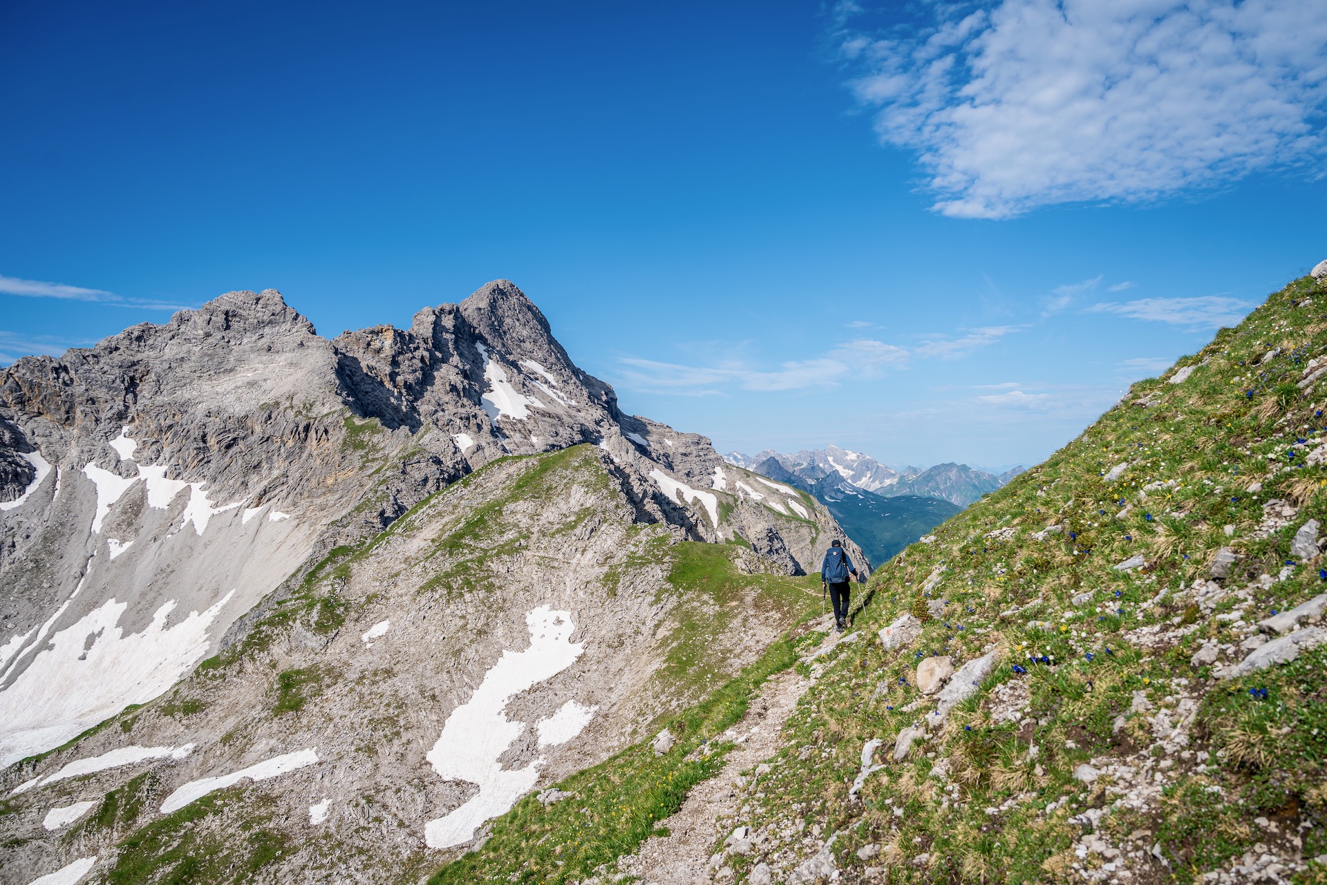 Kurz darauf warten die ersten Schneefelder, die sich in den steilen Nordausläufern des Biberkopfs bis in den Sommer hinein halten. Die Altschneefelder machen den Aufstieg ungleich schwerer als er eigentlich wäre. Langsam tasten wir uns dem Biberkopf entgegen, passieren seine Flanken im losen Schotter, unter dem es steil nach unten ins saftige Gras geht. Auf den letzten Metern bevor wir auf den Aufstieg von Warth-Lechleiten treffen, halten wir uns unmittelbar am Fels.