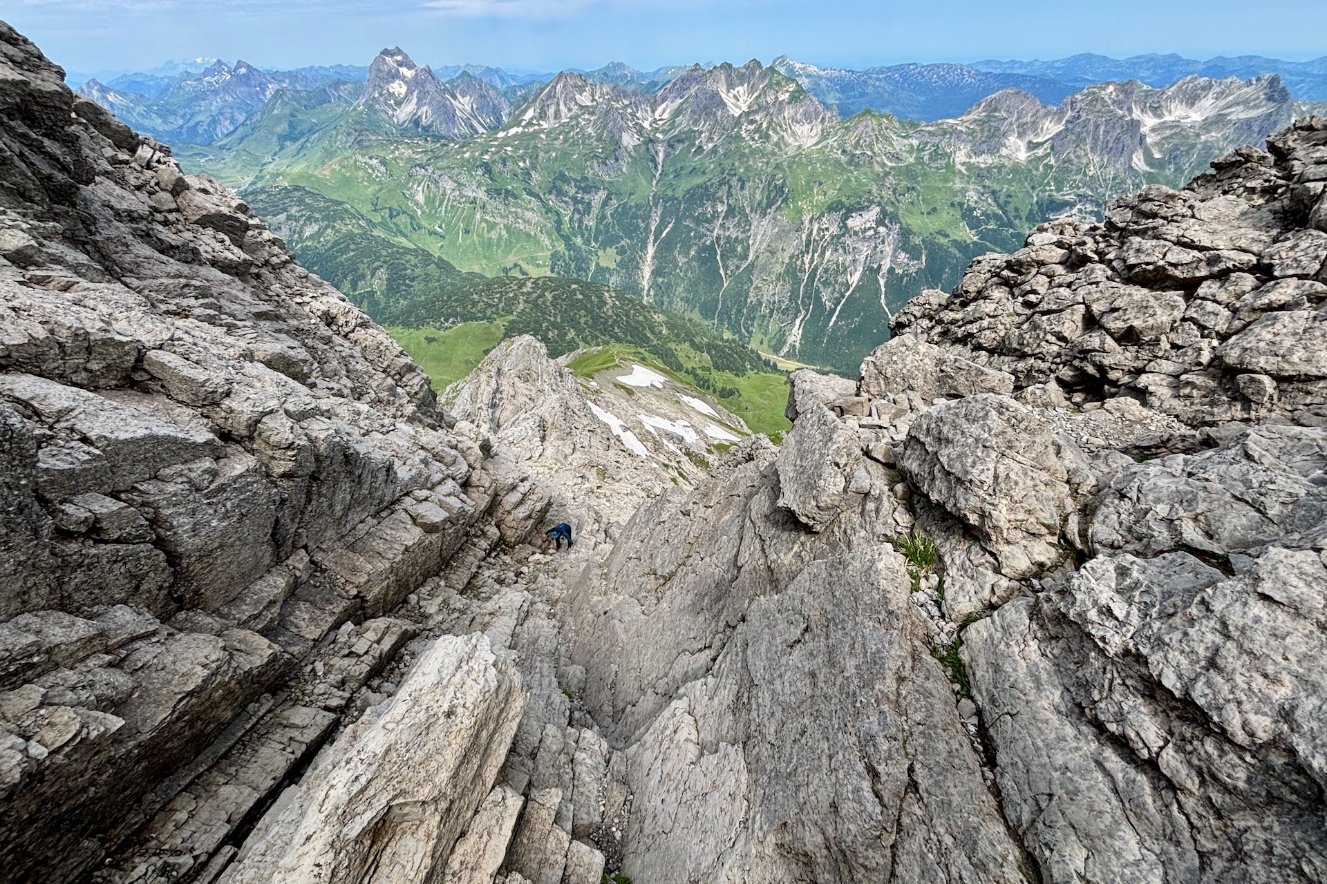 Der Charakter der bis hier schon anspruchsvollen Bergtour ändert sich nun nochmal. Im gutmütigen Felsgelände windet sich der Aufstieg nun durch die steile Westflanke. Der Fels ist fest, hier und da muss zugepackt werden. Die Schwierigkeiten bewegen sich im I. Schwierigkeitsgrad nach UIAA. Die letzten Meter geht es am Grat zum höchsten Punkt. Etwa zwei Stunden nach dem Hochrappenkopf ist der Biberkopf (2.599 m) und mit ihm der sechsthöchste Berg Deutschlands bestiegen. Vom Gipfel wartet ein herrlicher Blick in die Allgäuer und die Lechtaler Alpen.
