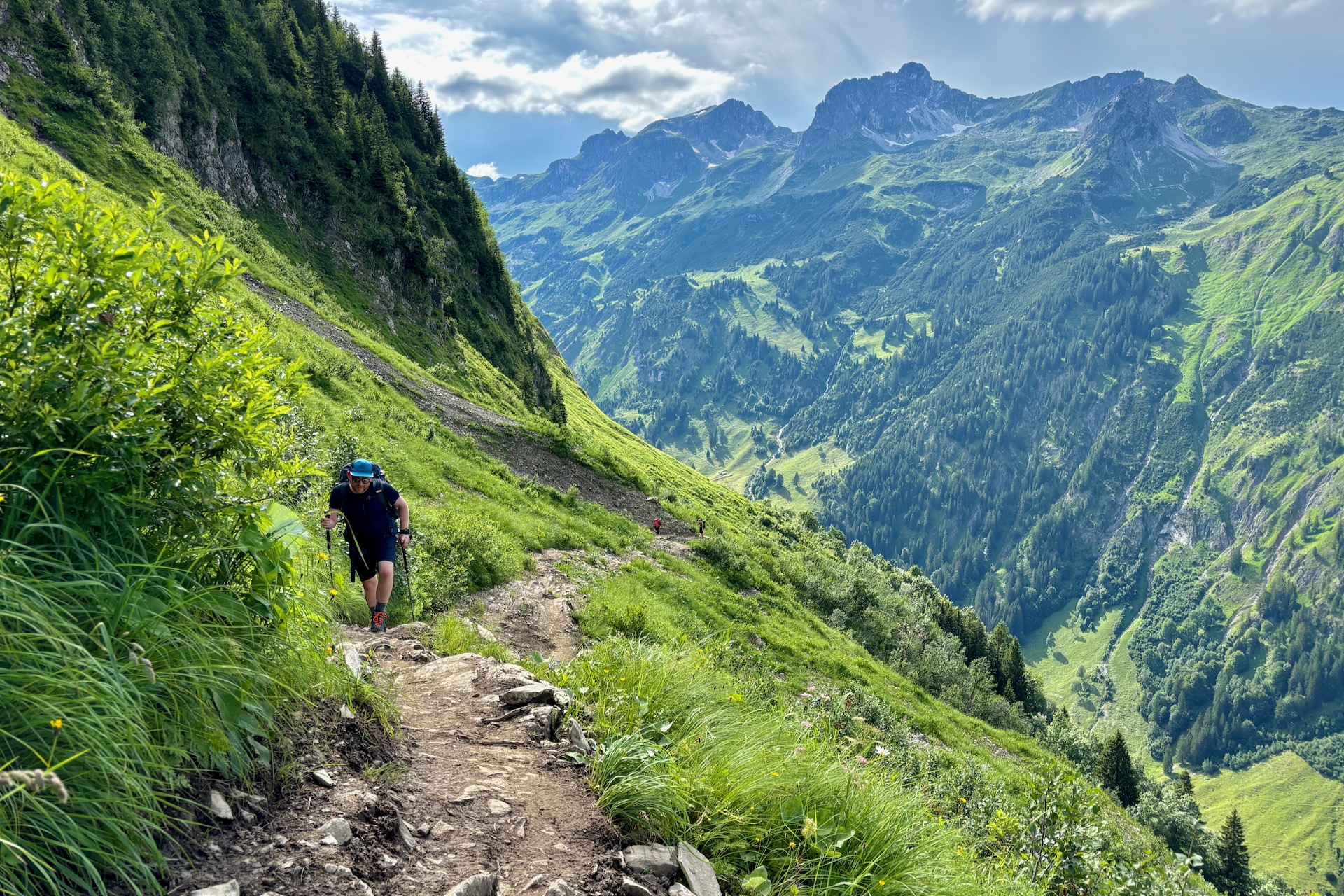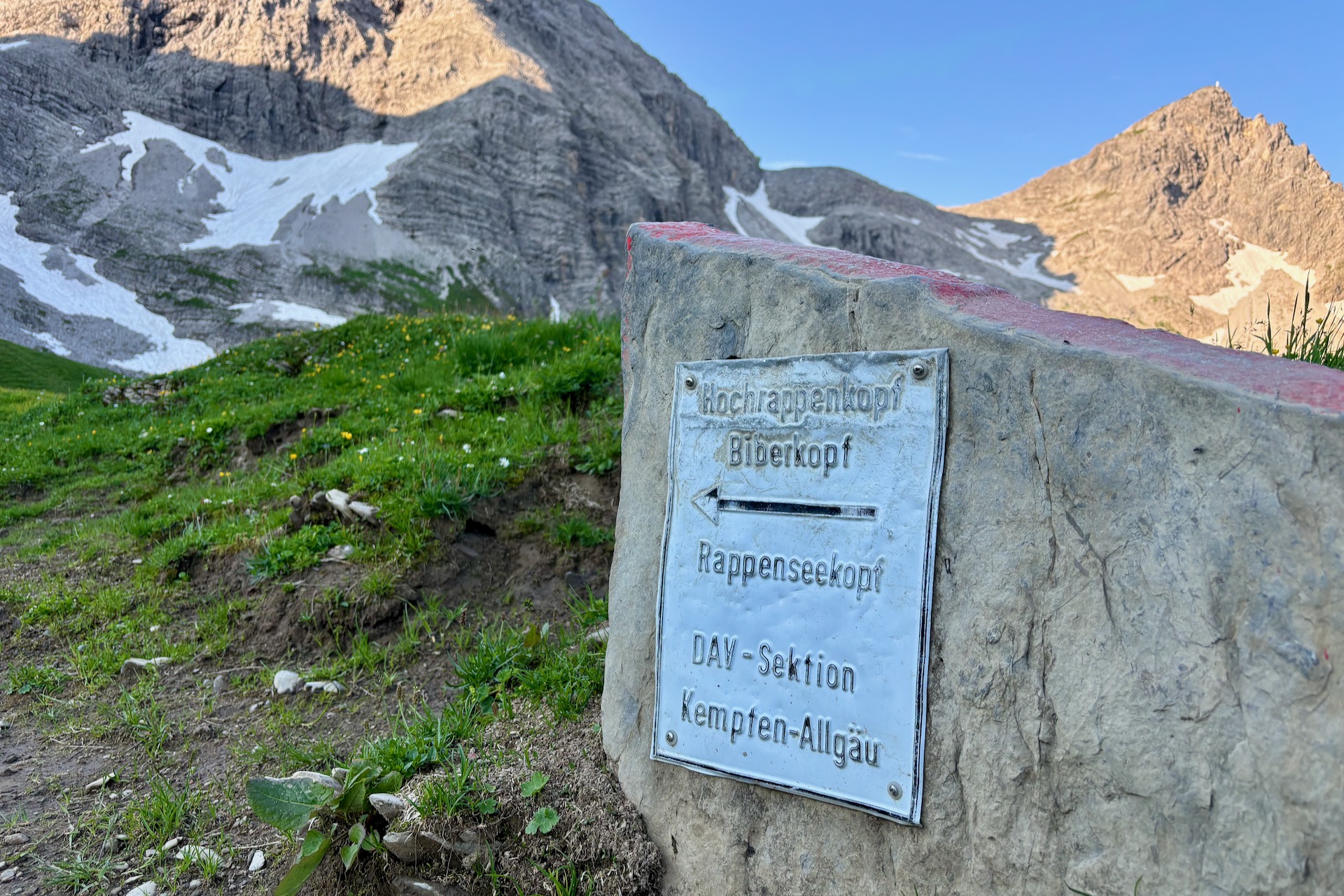 Am nächsten Morgen starten wir unseren Weiterweg zum Biberkopf. Wichtig: Die Getränkereserven auffüllen, denn unterwegs gibt es keine Möglichkeit für frisches Wasser. Mitten in der Hochsaison ist die Hütte ausgebucht und doch kaum 100 Meter nachdem wir die Rappenseehütte hinter uns gelassen haben, ist vom Trubel nichts mehr übrig. Der überwiegende Großteil der Wanderer und Bergsteiger wandert auf dem Heilbronner Höhenweg weiter. Den Abzweig in Richtung Hochrappenkopf und Biberkopf nimmt nicht einmal eine Handvoll Wanderer.