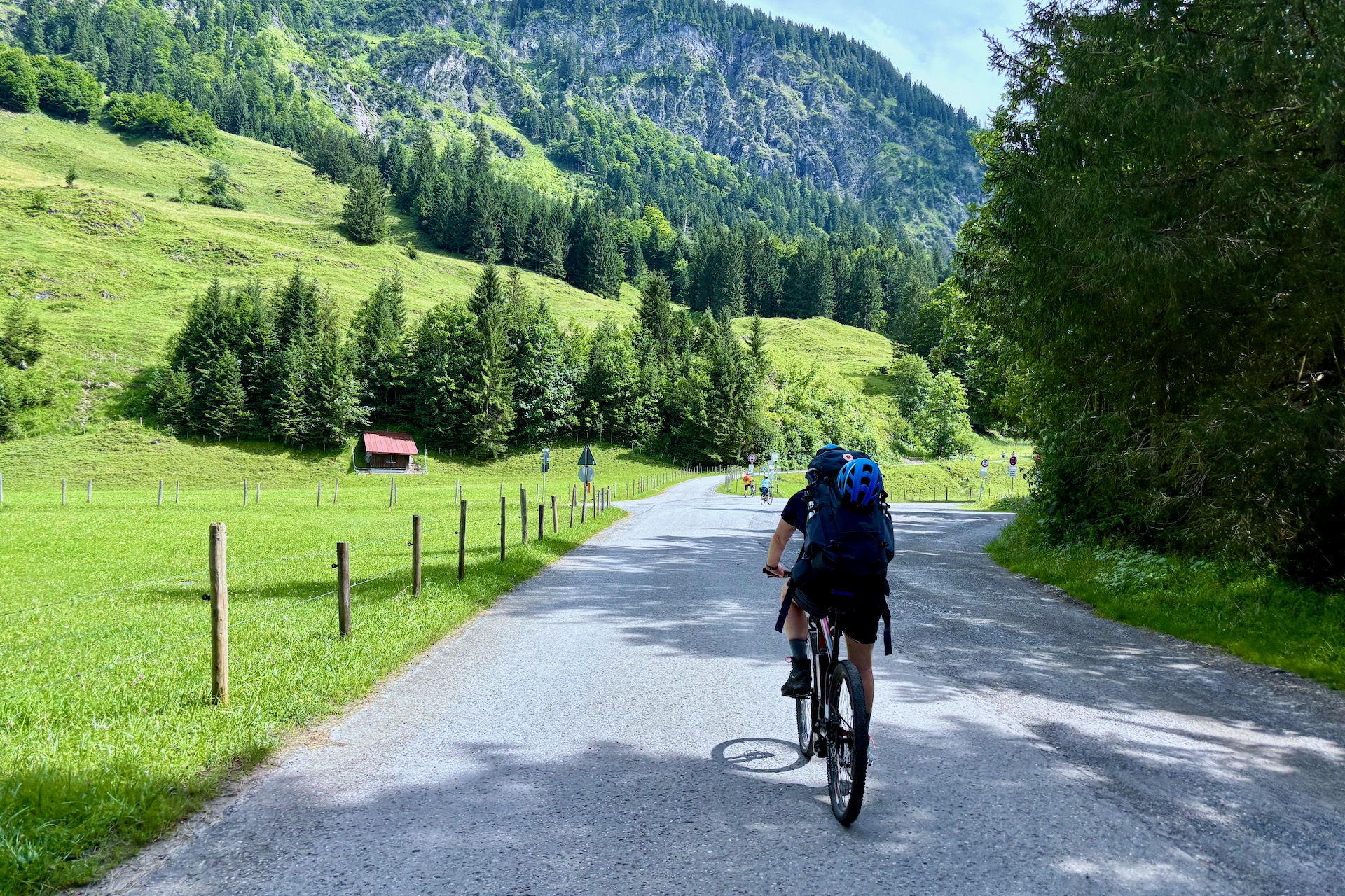 Am Fuß der Fellhornbahn in Faistenoy startet der Aufstieg zur Rappenseehütte, der ersten Etappe der Bergtour auf den Biberkopf. Der Weg durchs Stillachtal und ins Rappenalptal vorbei an Birgsau und Einödsbach ist lang. Mit dem Bus kann der Weg bis zur Alpe Eschbach etwas verkürzt werden. Noch ein ganzes Stück weiter geht es mit dem Fahrrad. Ein paar kurze steile Anstiege gilt es zu überwinden. Statt dem direkten Aufstieg zur Petersalpe folgen wir der Straße bis zur Breitgehrenalpe. Hier geht es links über den Rappenbach und schließlich steil hinauf zur Petersalpe, wo es für den Drahtesel nicht mehr weiter geht.