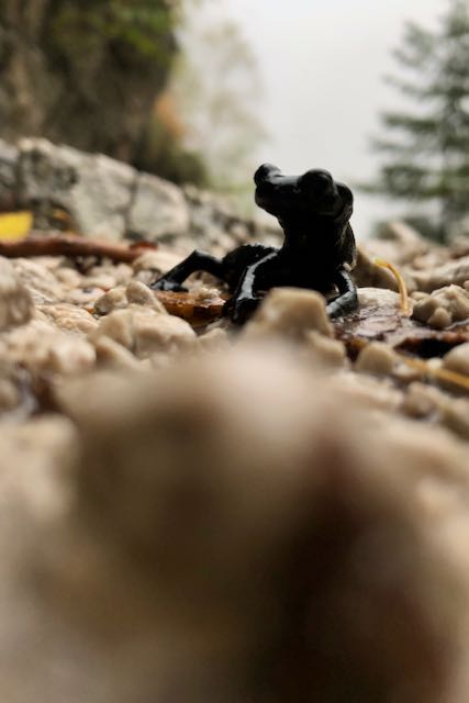 Während der Alpensalamander eine schmalere Statur und vollkommen schwarz ist, ist der Feuersalamander kräftigerer Natur. Und mit seinen großen gelb-leuchtenden Flecken auf schwarzem Grund fällt er umso mehr auf.