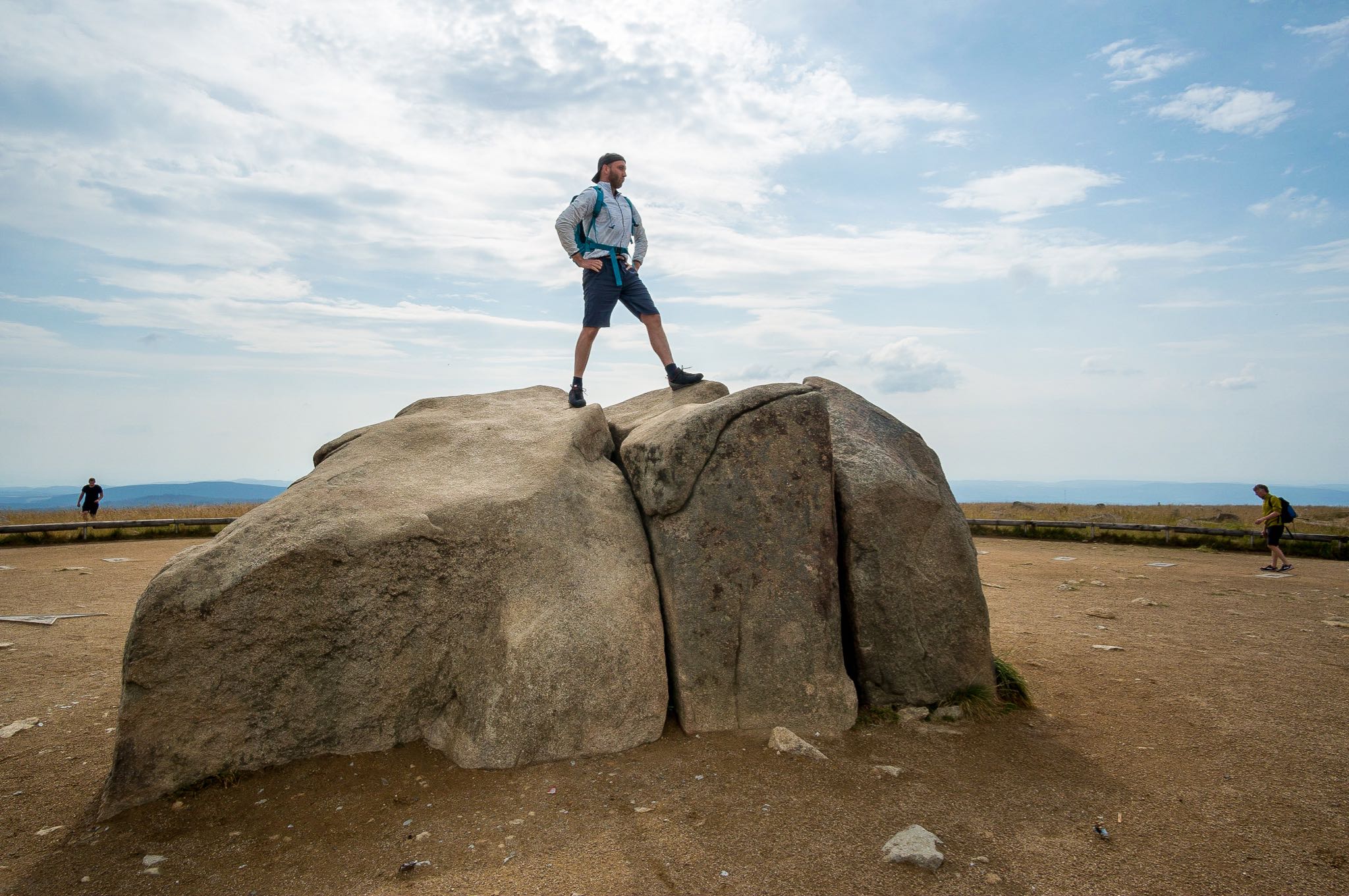 Es ist drückend heiß als wir weit vor uns eine etwas andere Legende wahrnehmen. Nur mit Schuhen, einer Unterhose und einem komischen Rucksack bekleidet, wundern wir uns über das komische Outfit und machen alsbald die kurioseste Begegnung auf unserer 16 Gipfel-Reise quer durch Deutschland.
