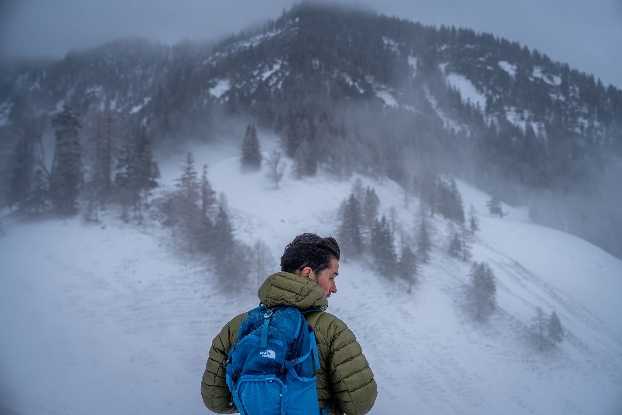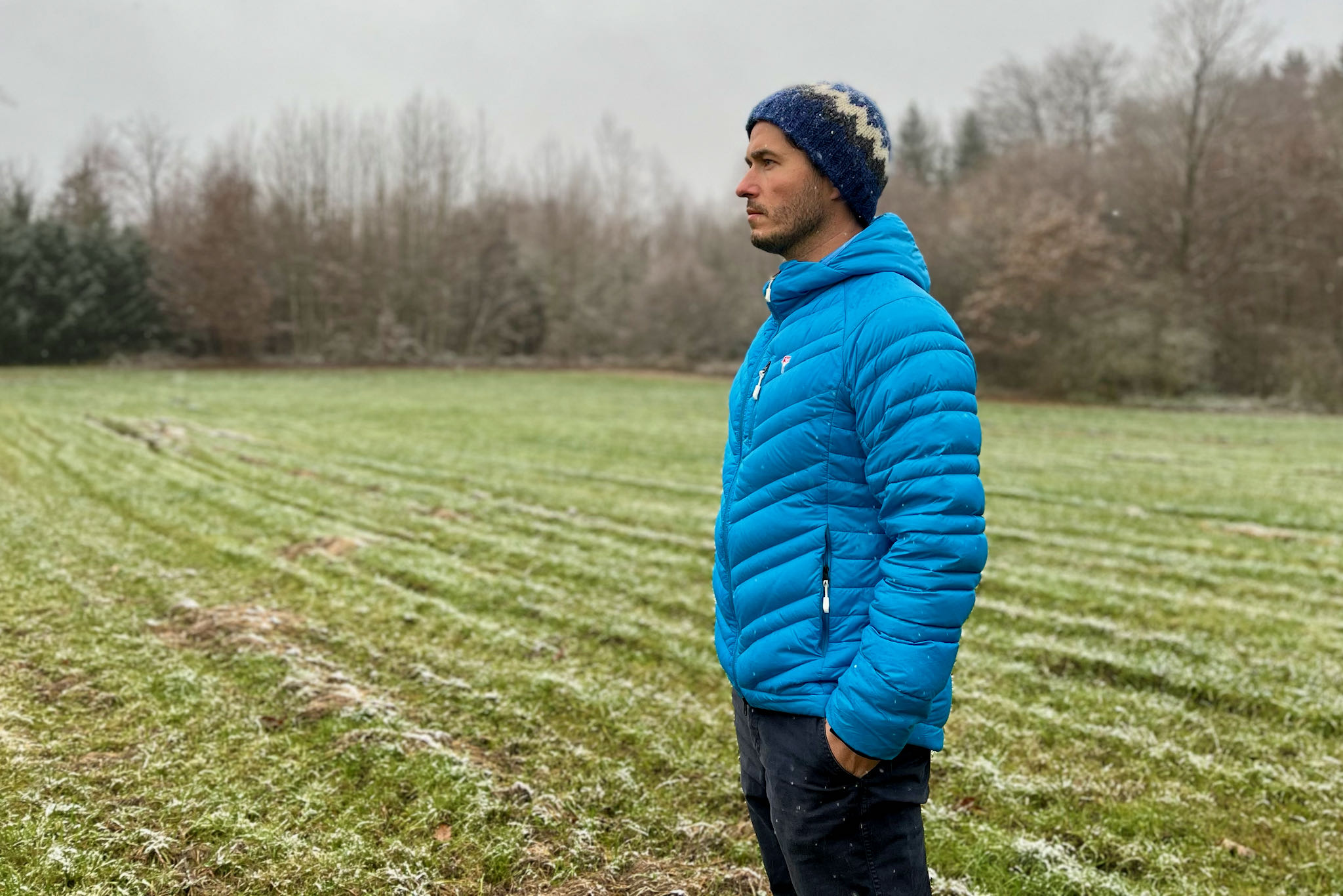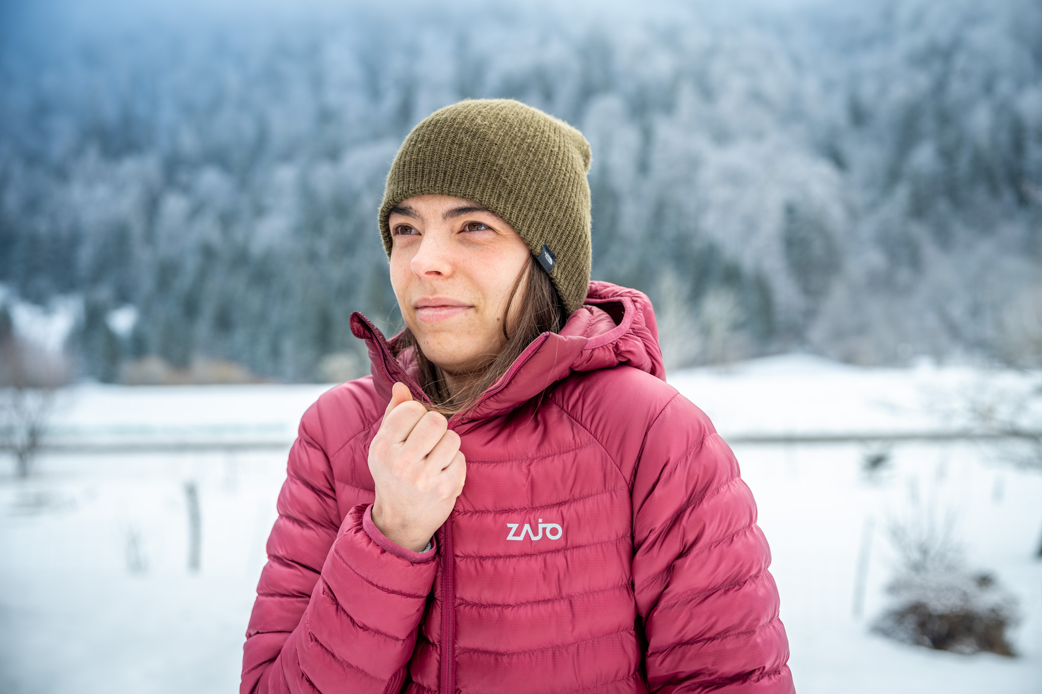 Die Isolationsjacke ist keine herkömmliche Daunenjacke, sondern mit ihrer Füllung aus 70 Prozent Daune und 30 Prozent Wolle eine Mischung. Einmal angezogen, spendet sie schnell Wärme. Und das auch, der beigemischten Wolle sei Dank, wenn es nass wird.