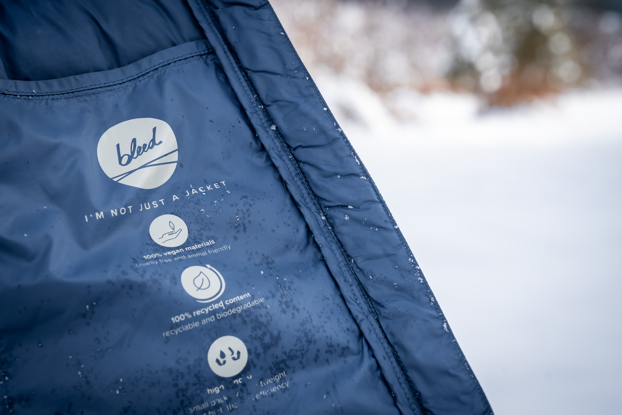Die No Down-Jacke von Bleed kommt nicht nur mit einer künstlichen Füllung mit Isolationsmaterial von Primaloft, sondern schreibt sich auf die Karten (und die Innenseite der Jacke), komplett vegan zu sein.