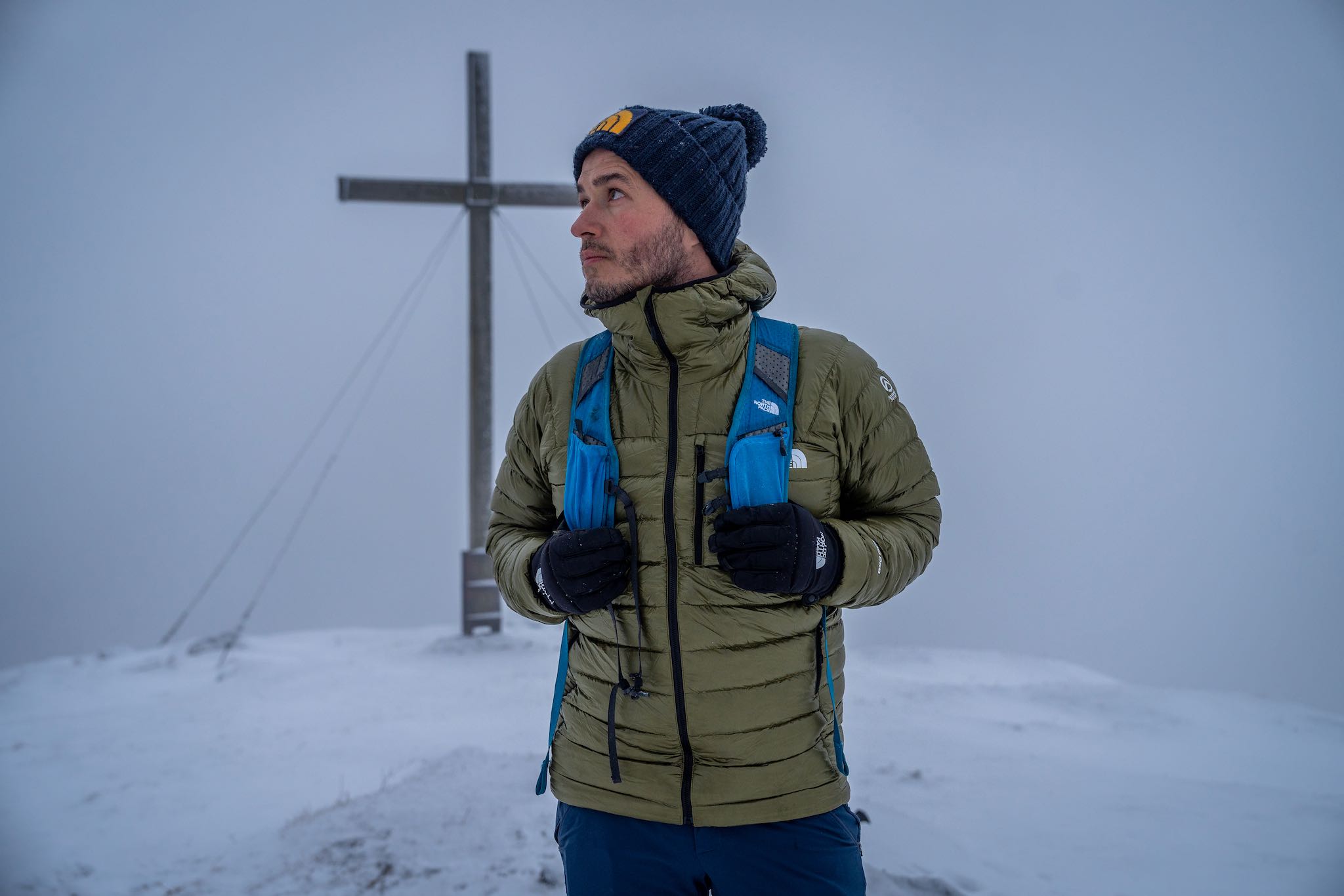 Hergestellt ist sie aus recyceltem Nylon. Mit ihrer Bauschkraft von 800 cuin spielt sie im sehr warmen Segment mit und das beweist sie in der Praxis eindrucksvoll. Nur mit einem Baselayer drunter wird es beim winterlichen Aufstieg knapp unter dem Gefrierpunkt schnell schon viel zu warm. Dabei ist die Isolationsjacke relativ körpernah geschnitten, wobei sie nicht ganz so sportlich ausfällt wie andere Produkte von The North Face. Trotzdem ist die Bewegungsfreiheit – gerade an den Armen – absolute Spitzenklasse. Weder verrutscht die Jacke am Rücken, noch an den Bündchen.