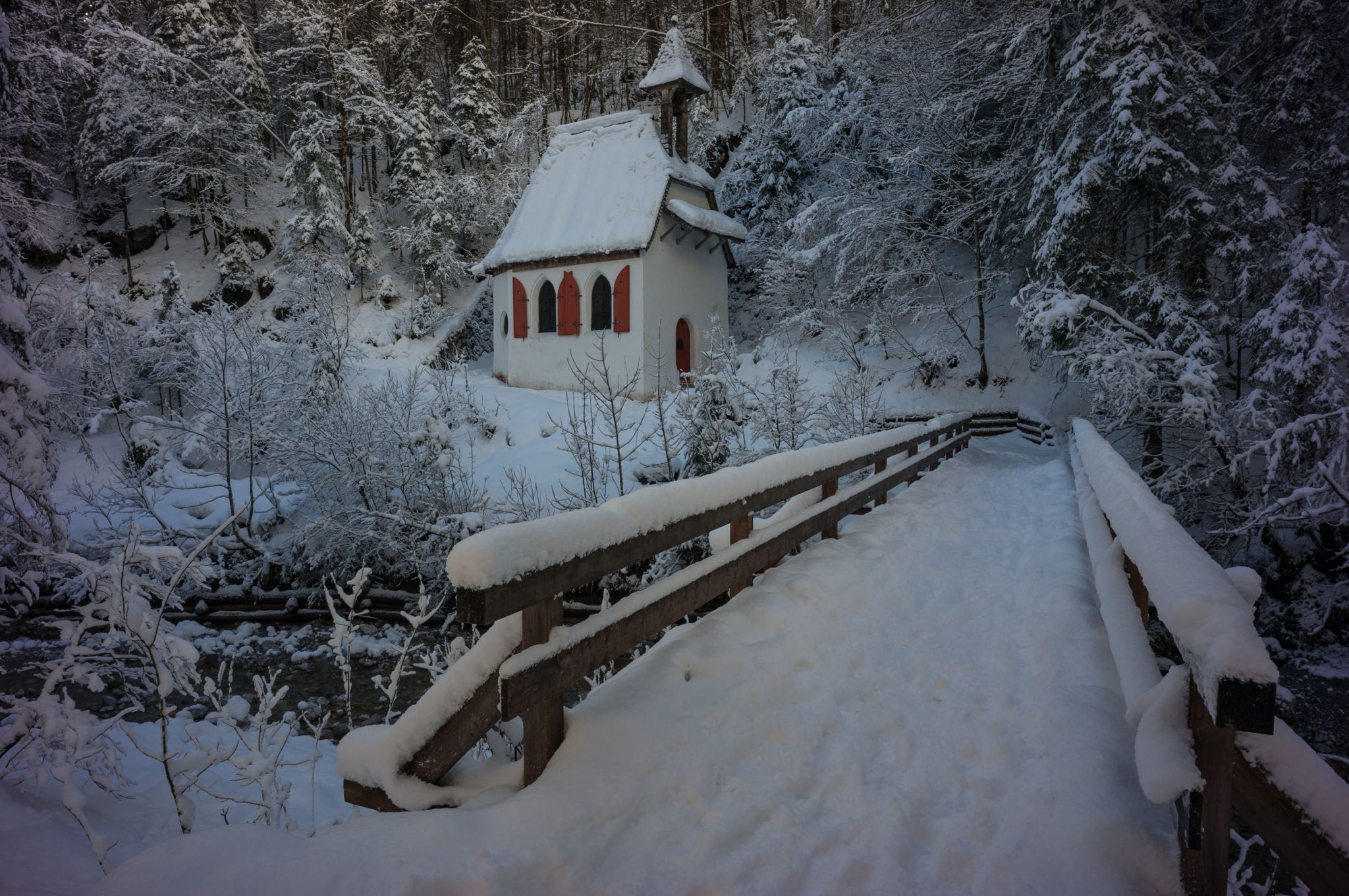 Unser Weg führt uns schnell weg vom Trubel rund um die Kapelle. Ein breiter Weg führt uns durch den Wald, wo zwischen den Bäumen die Sonne funkelt. Der Anstieg ist kaum erwähnenswert. Erst als wir bei der Kapelle St. Johann und Paul erstmalig den Eisgraben überqueren, wird es nicht nur finster, sondern auch etwas steiler. Trotz des vielen Schnees im noch jungen Winter, geht es gut voran.