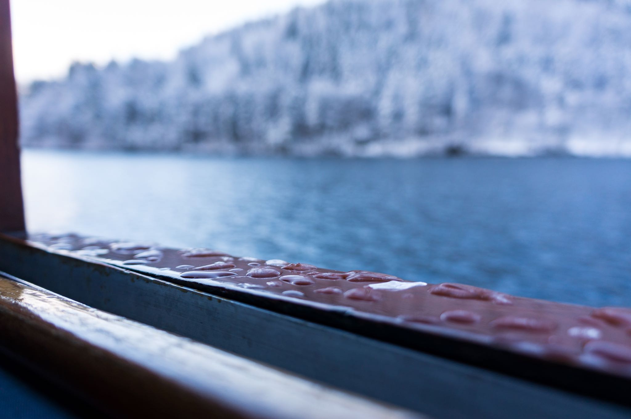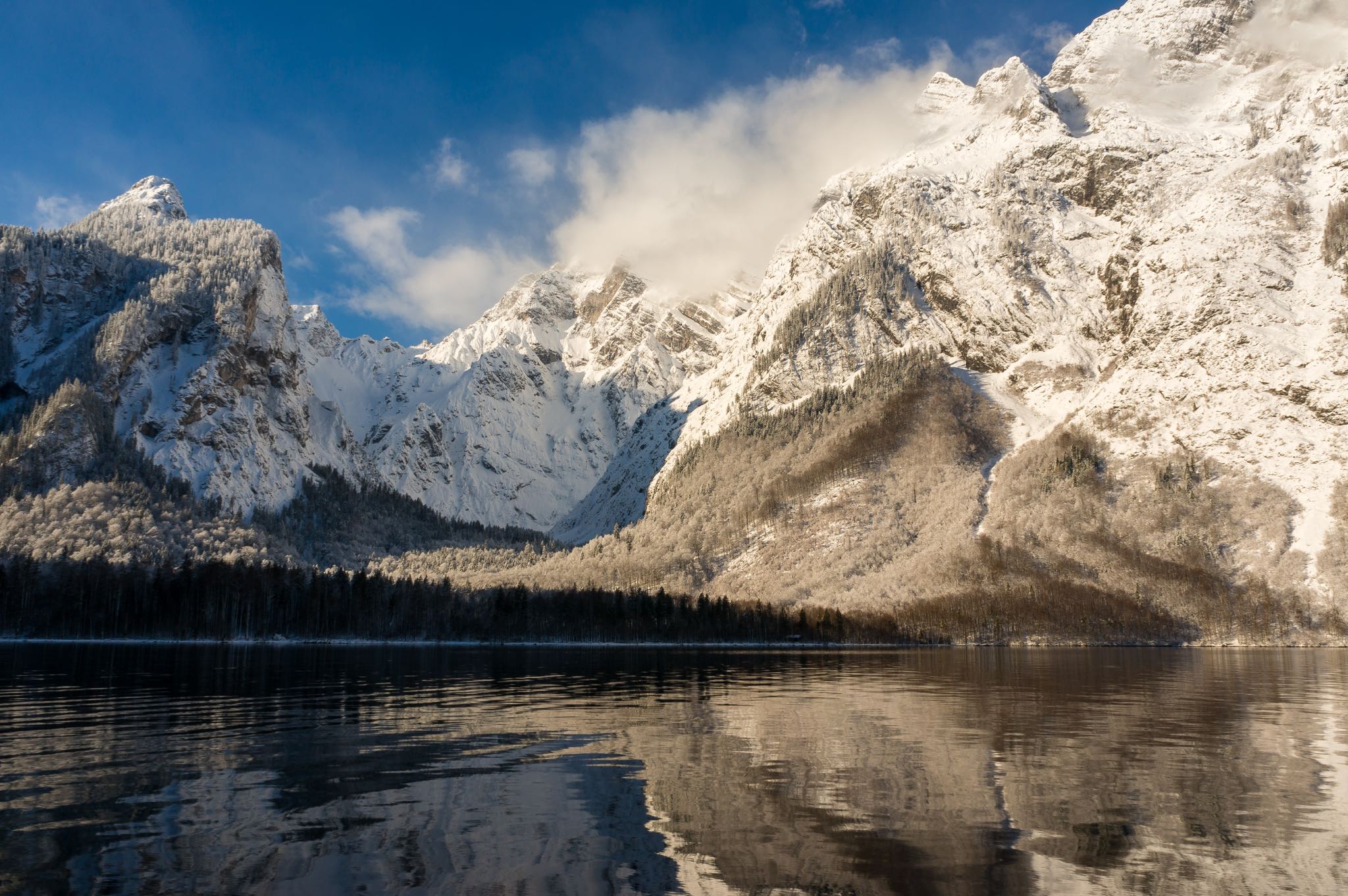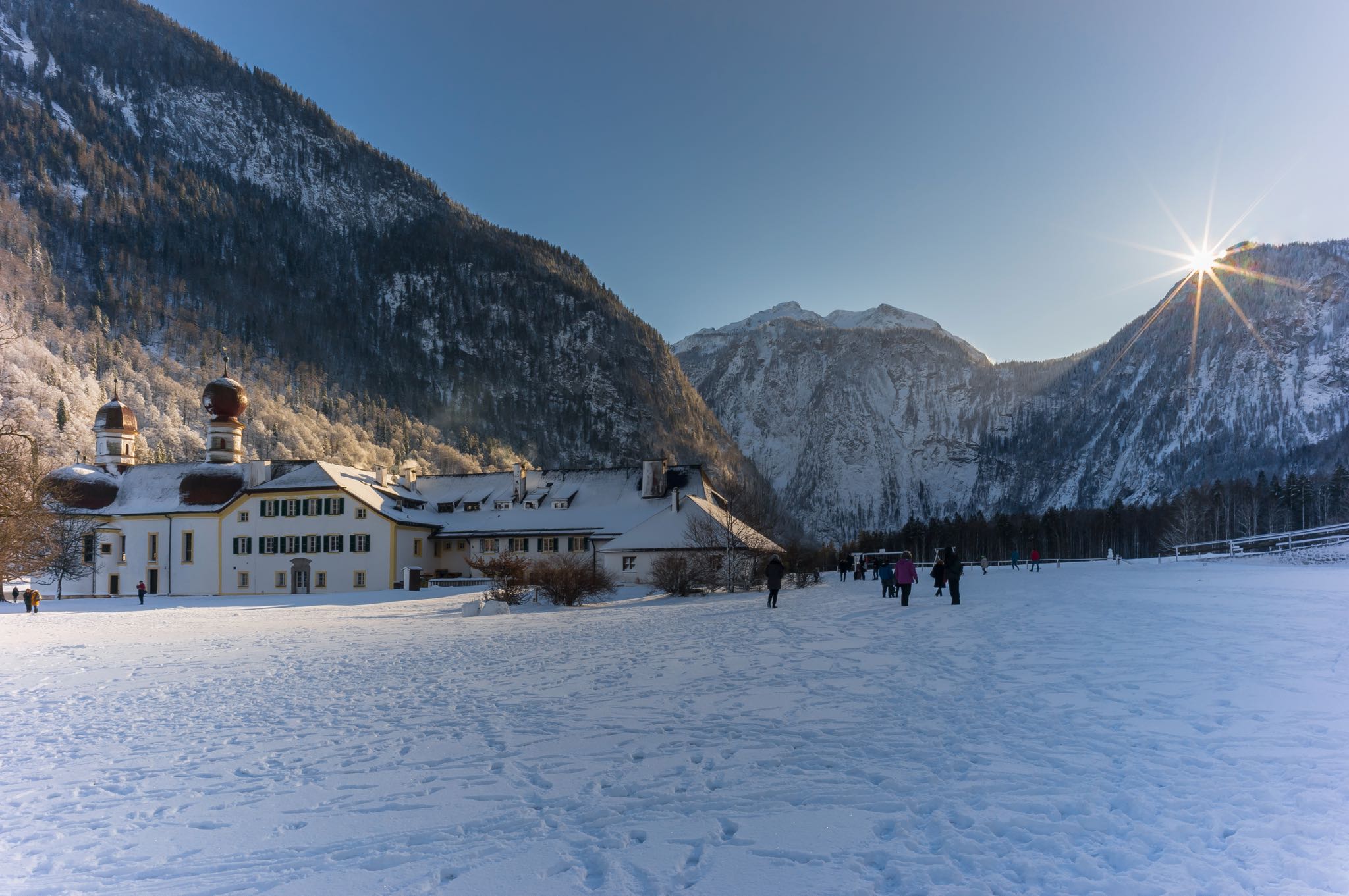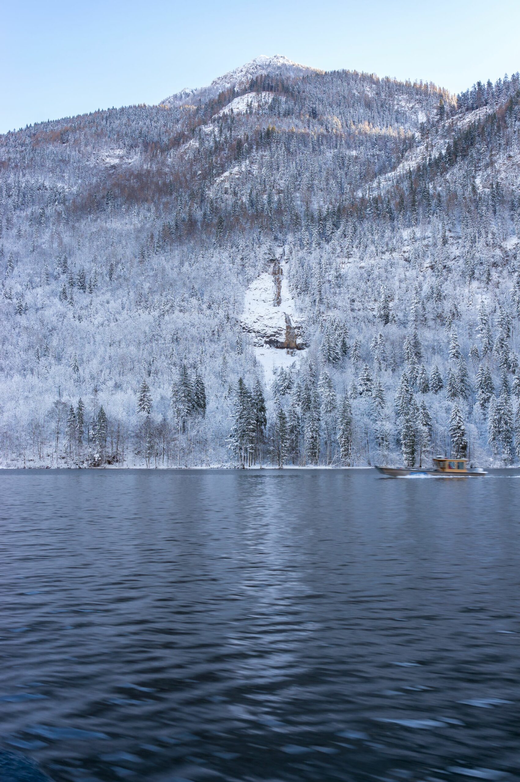 Rudern müssen wir heute zum Glück nicht mehr. Mit einem der ersten Boote des Tages fahren wir nach St. Bartholomä (Winterfahrplan beachten, hin und zurück 15 €). Die Beliebtheit des Königssees scheint selbst im Winter nur wenig abzuebben und die Boote sind bis auf den letzten Platz gefüllt. Vorbei am Königsbach-Wasserfall und der berühmten Echo-Wand tuckern wir gemütlich St. Bartholomä entgegen und sind froh, die etwa fünf Kilometer lange Strecke nicht im Ruderboot absolvieren zu müssen.