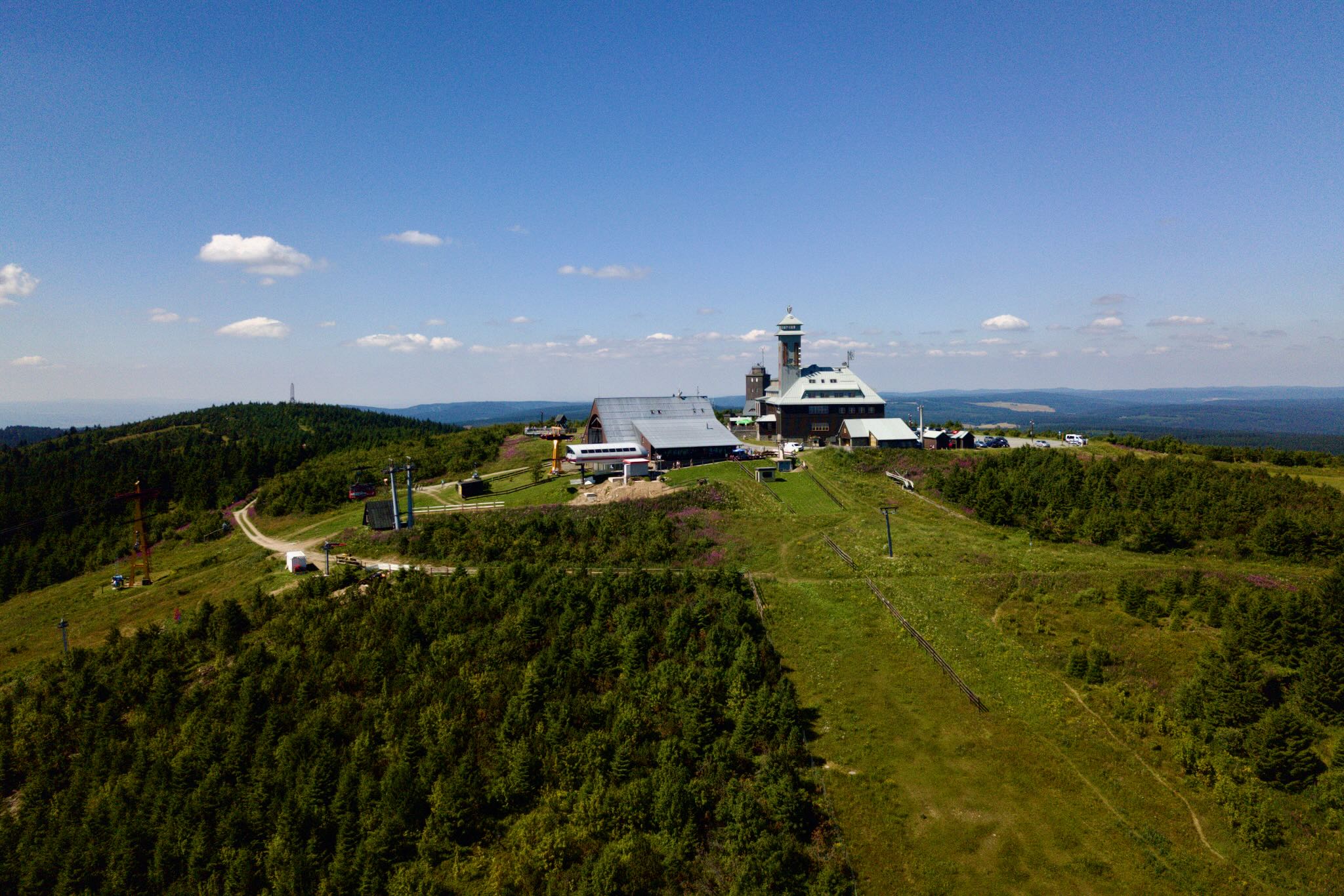 Erkannt wird Jens Weißflog auch heute immer noch. Der “Floh vom Fichtelberg” wie er ob seiner Größe und schmächtigen Statur früher genannt wurde, macht bereitwillig alles mit. Erst recht als wir nach dem fortgesetzten Aufstieg über breite Wanderwege und durch angenehm schattigen Wald am Gipfel des Fichtelbergs auf 1.215 m Höhe ankommen.