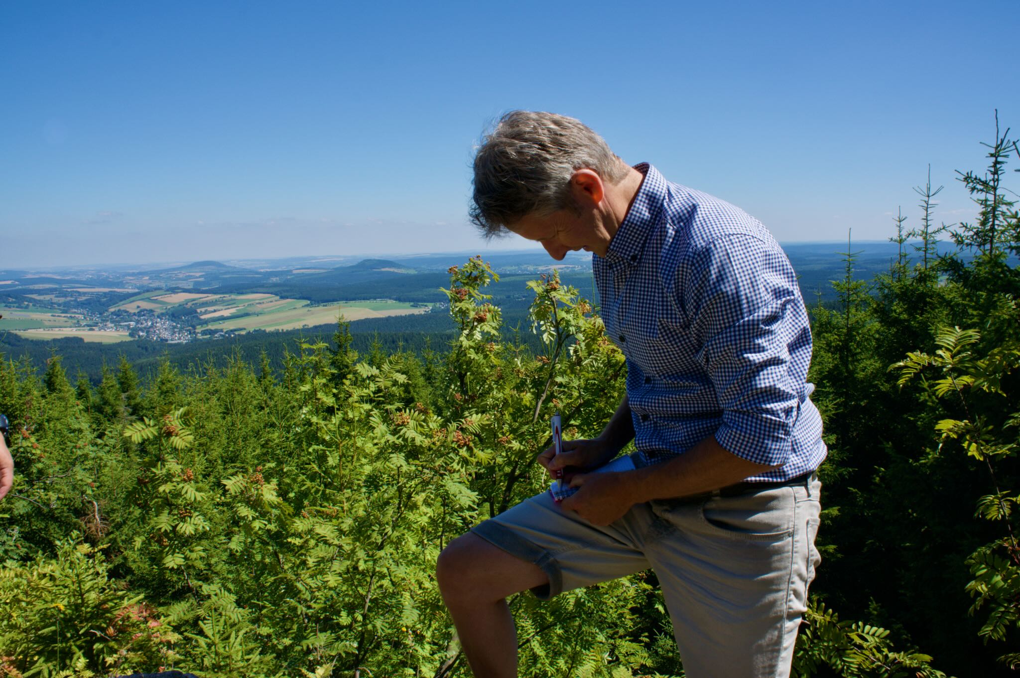 Reisebusse, Schwebebahn und Seilbahn laden unzählige Urlauber aus und natürlich ist die Skisprunglegende schnell erkannt. Ein Foto hier, ein Autogramm da. Einige scheinen das tolle Panorama hinüber zum Kleinen Fichtelberg, aufs Erzgebirge und wohl halb Sachsen zu vergessen. Verrichteter Dinge, etliche Unterschriften und Gipfelfotos später, machen wir uns schließlich wieder an den Abstieg über sommerliche Pisten des Skigebiets.
