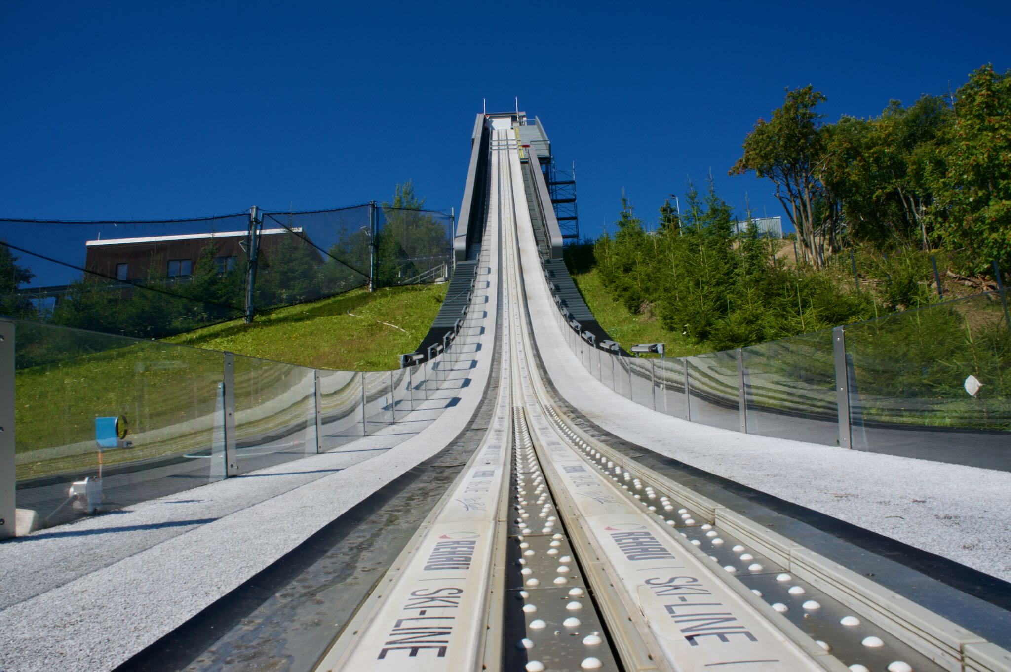 Oberwiesenthal, das mit seiner Höhe auf 914 Metern schon seit jeher Wintersport-Ort ist und neben Jens Weißflog noch weitere erfolgreiche Wintersportler hervorgebracht hat, liegt direkt an der tschechischen Grenze im Erzgebirge. Auf dem Philosophenweg durchwandern wir die Fichtelberg-Schwebebahn und kommen bald an der Skisprungschanze raus, auf der auch im Sommer reger Betrieb herrscht.
