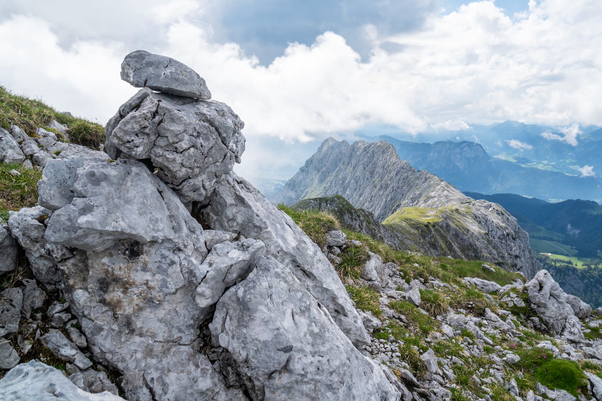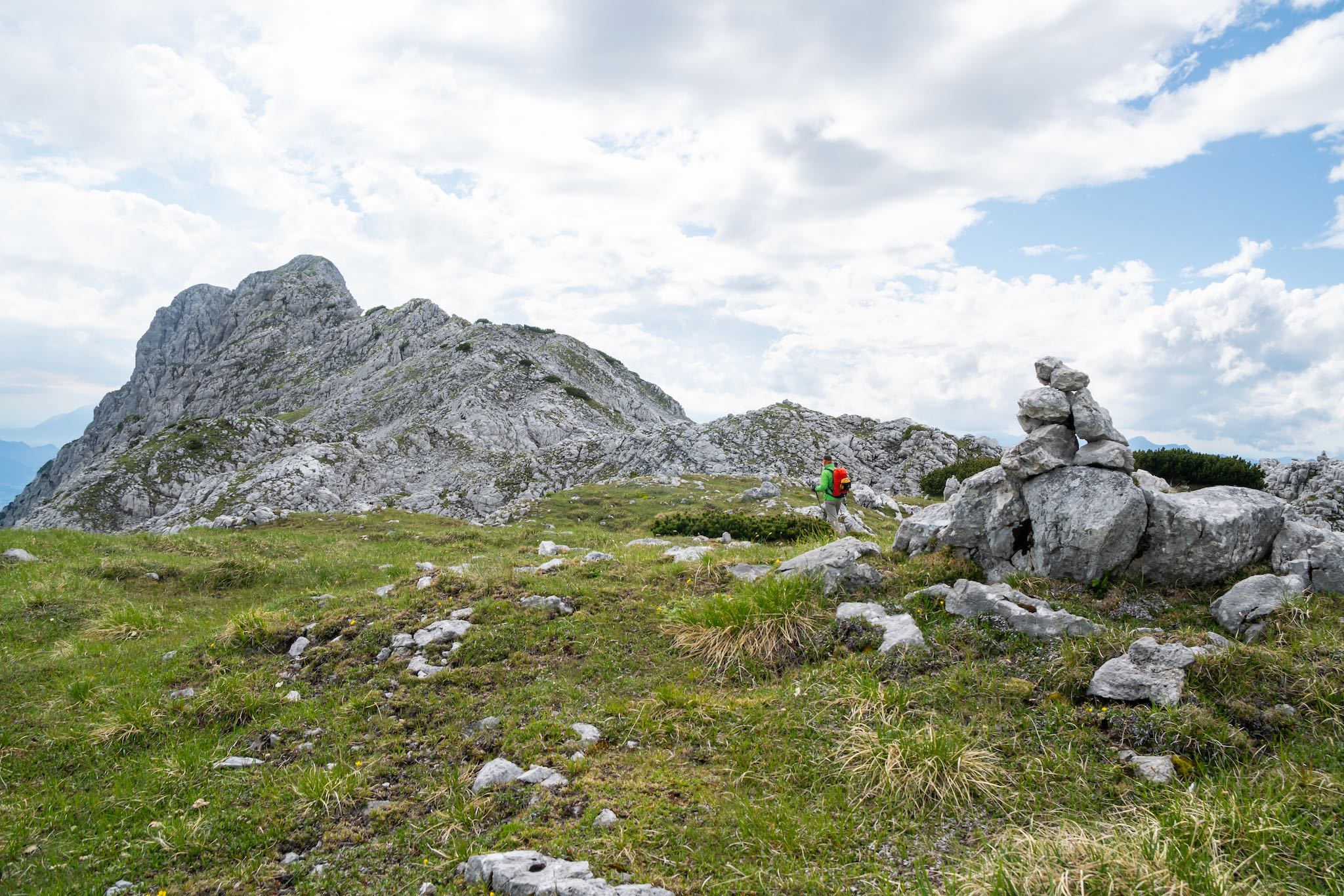 Kurz bevor der Gipfel des Sonnecks erreicht ist, weist ein markantes Steinmandl auf den Abzweig zu den Hackenköpfen hin. Der komplette Grat, der uns über die nächsten Stunden begleiten wird, liegt nun in seiner ganzen Pracht vor uns.