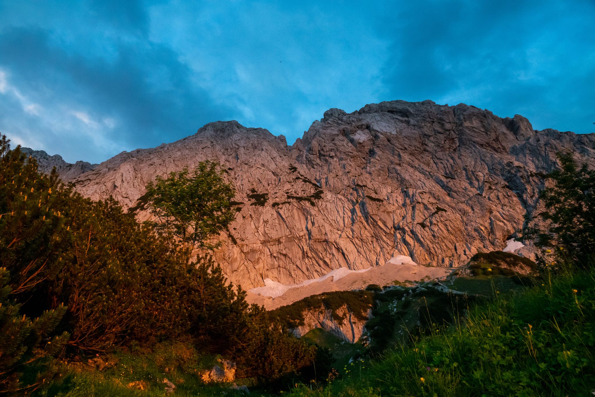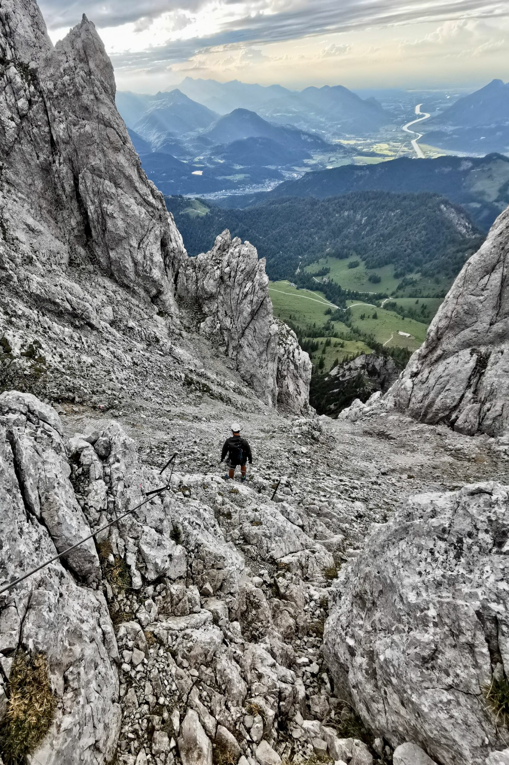 Nach der erfolgreichen Überschreitung der Hackenköpfe wartet nun noch der Abstieg über den versicherten Widauersteig zur Kaindlhütte. Der erste Teil führt einfach, aber mit viel lockerem Gestein unter den Füßen abwärts, bevor wir die beinahe senkrechten und glatten Felswände über dem Schuttkar mit den furchteinflößenden Namen “Großer und Kleiner Friedhof” immer wieder sehr exponiert queren. Nach etlichen Trittstufen gelangen wir an den eigentlichen Einstieg des Klettersteigs und wandern in weiteren knapp 30 Minuten bis zur Kaindlhütte.
