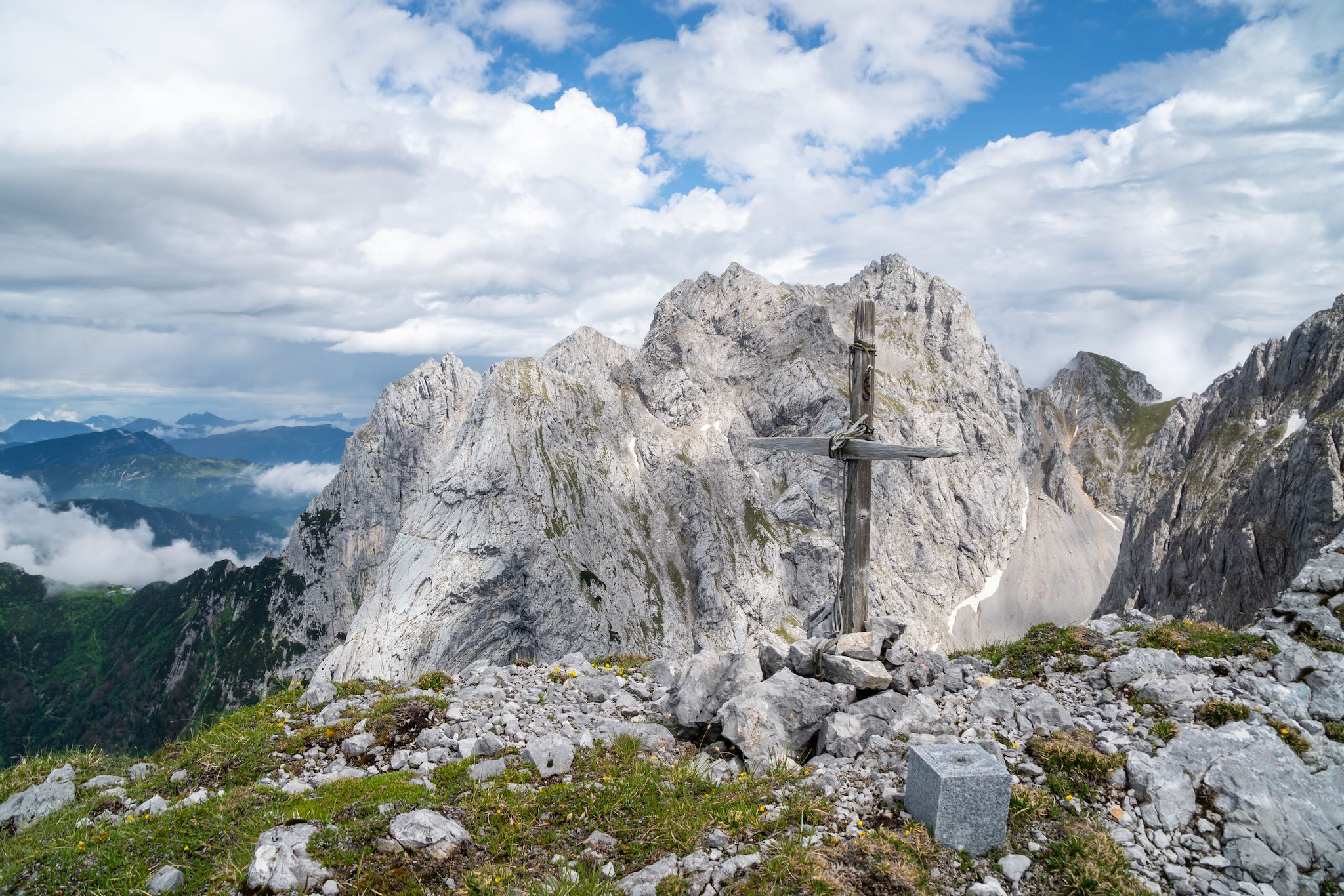 Nah am Kamm erfolgt nun der deutlich leichtere Aufstieg zum Oberen Gamskarköpfl, dessen windschiefes Gipfelkreuz zum Durchschnaufen einlädt. Die Blicke zum Stripsenhaus und Stripsenjoch, zu Ellmauer Halt und Kaiserschützensteig sowie auf die andere Talseite in den Zahmen Kaiser sind beeindruckend. In weiteren 30 Minuten ist ohne weitere Schwierigkeiten das Sonneck und damit der höchste Punkt der Tour (2.260 m) erreicht (1 h ab Scharte).