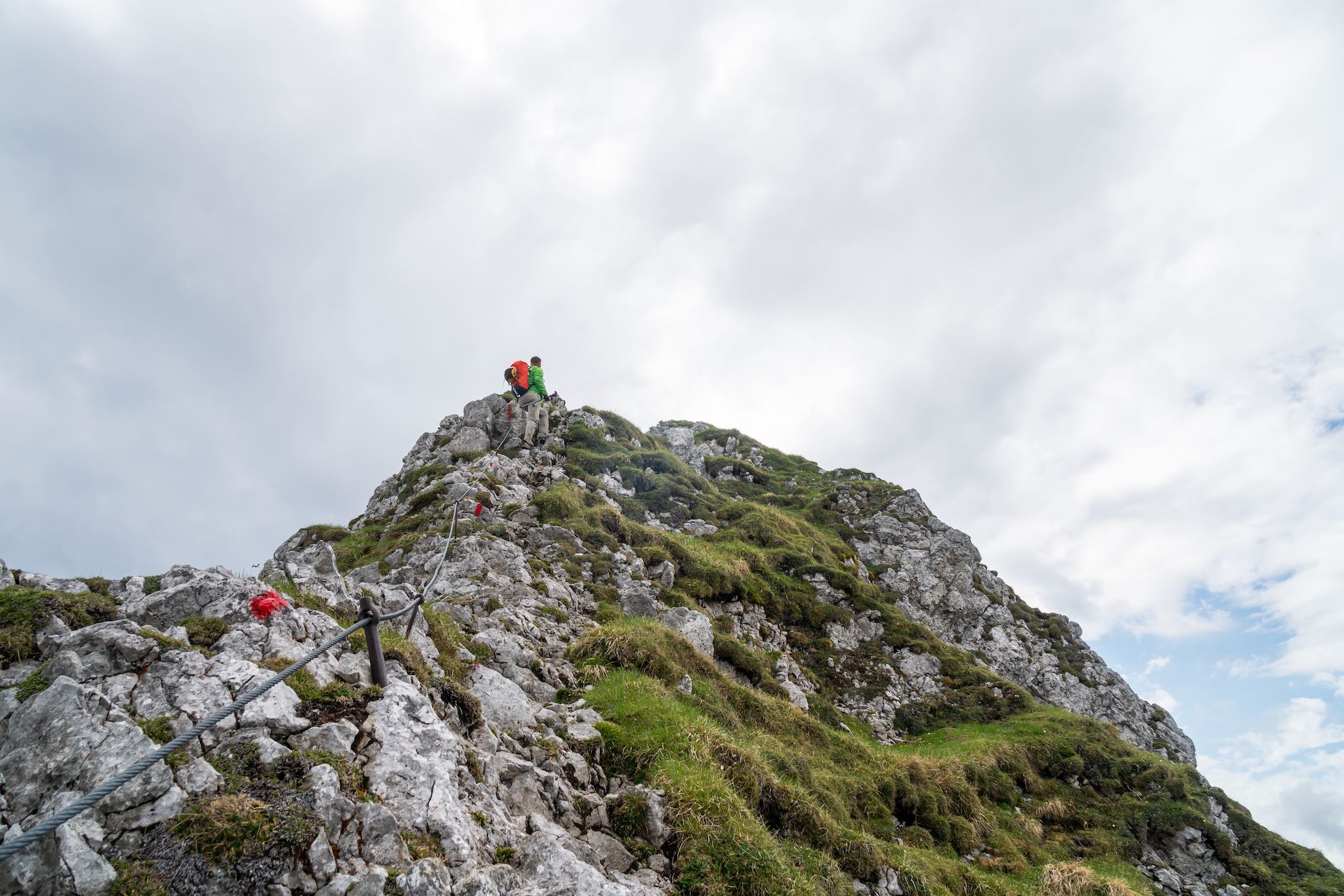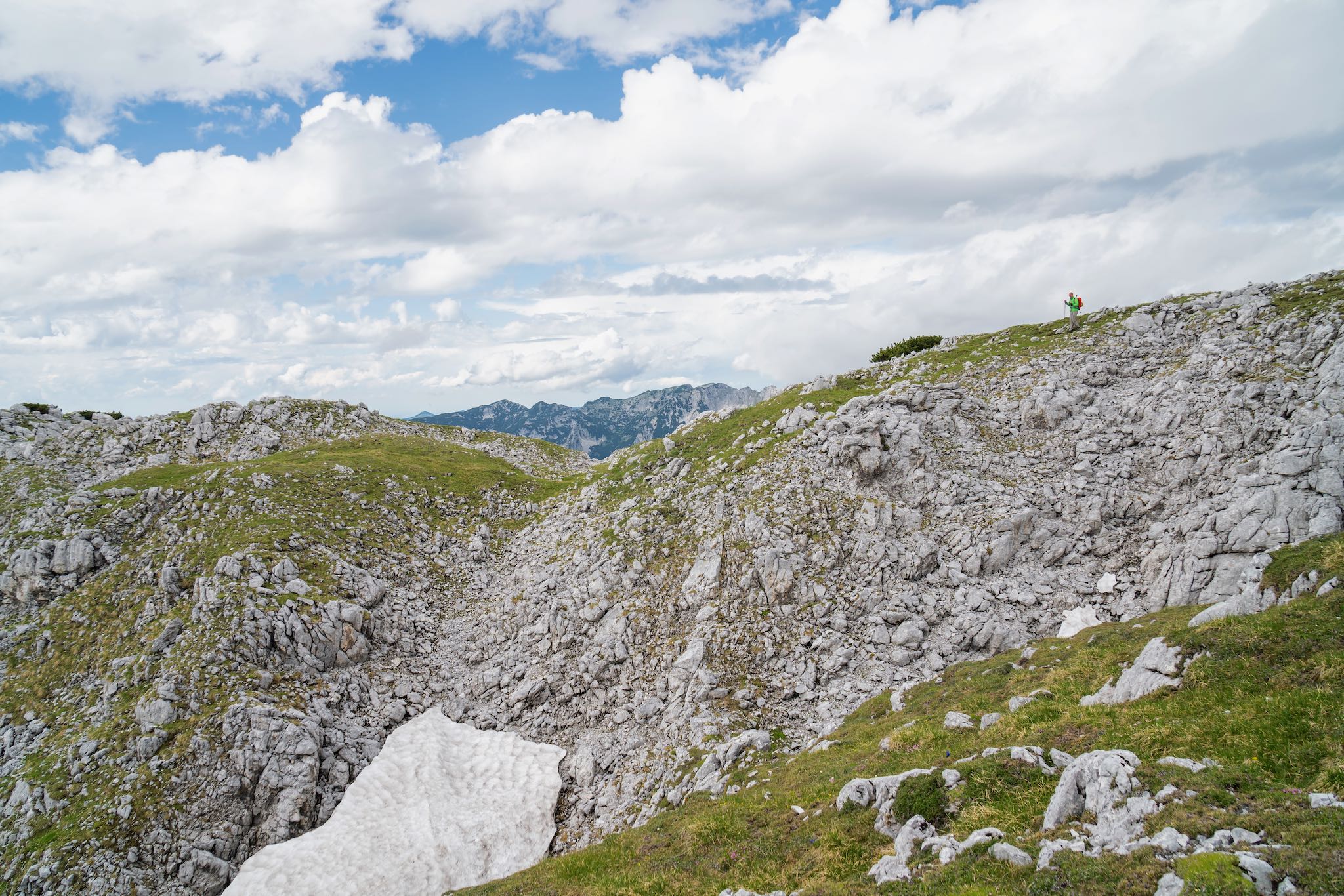 Hinter dem Wiesberg ändert sich das Szenario einmal mehr. Der Kamm wird langsam schmaler, immer wieder stellen sich Felsen in den Weg, die einfach überklettert werden. Dem Weg zu folgen, ist dabei nicht sonderlich schwer. Steinmänner und deutliche Wegspuren führen uns bis zum östlichsten Gipfel der Hackenköpfe (2.125 m). Auch rote Markierungen finden sich immer wieder. Besser zu finden sind die allerdings, wenn die Hackenköpfe Überschreitung in der anderen Richtung begangen wird.