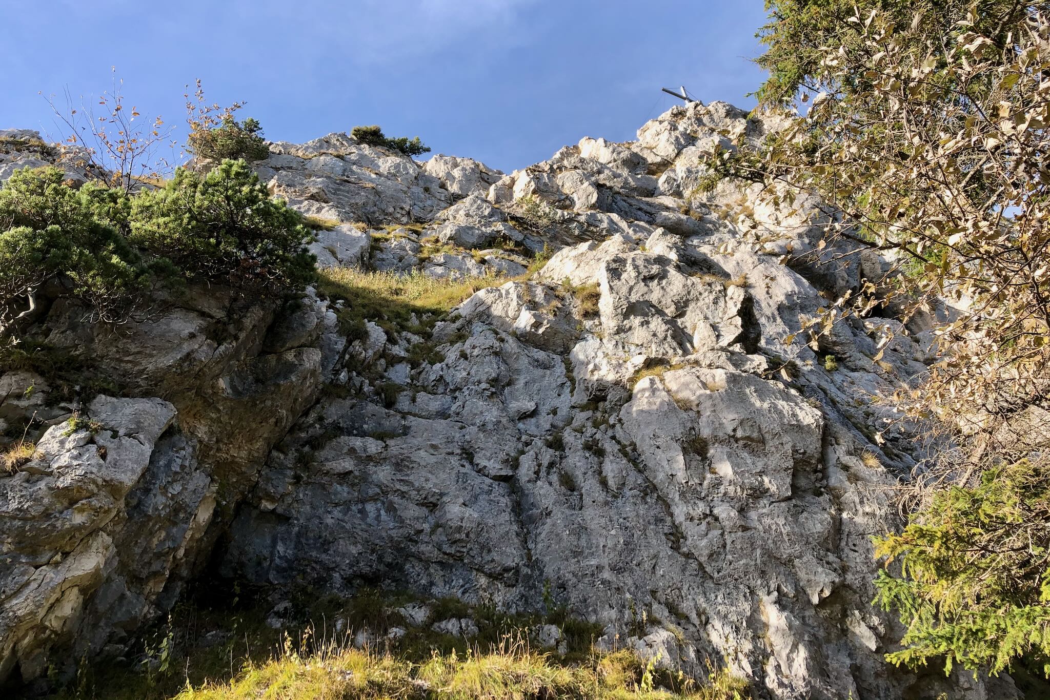 Wie aus dem Nichts türmt sich vor uns die Kindlwand auf. Die Kindlwand ist der vierte Gipfel des Heuberg-Massivs, der aber etwas schwieriger zu erklimmen ist als die benachbarten Gipfel. Es gilt hier den richtigen Einstieg zu finden.