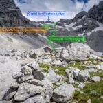 Das Schneefeld direkt unter dem Gipfelaufbau der Hocheisspitze wird wenn nötig an einer günstigen Stelle gequert und schließlich auf der rechten Seite umgangen und mühsam geht es im bröckeligen Fels- und Schuttgelände bis in die markante Scharte zwischen Hocheisspitze und Hocheiskopf (2.495 m).