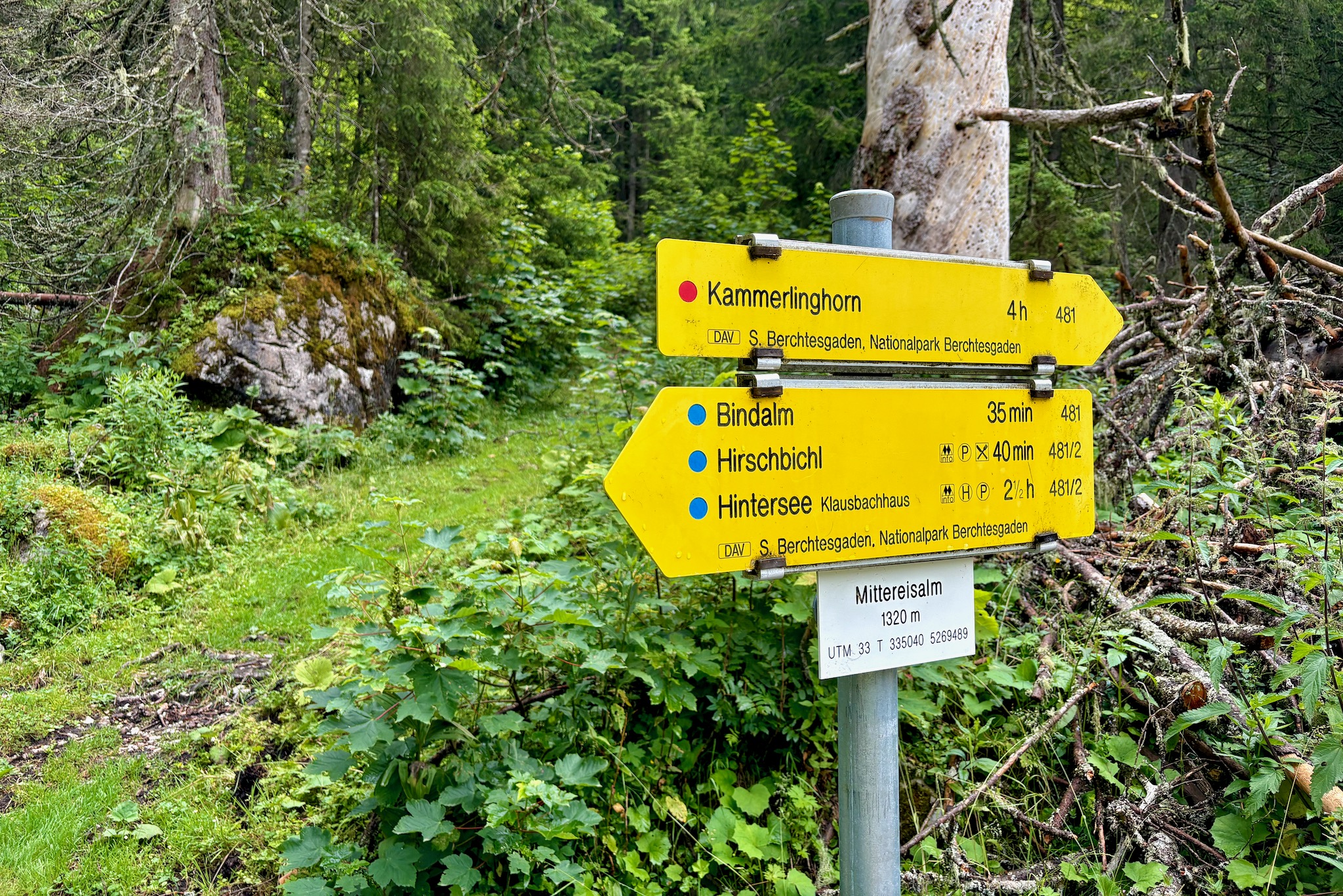 An der Mittereisalm angekommen, folgen wir – noch bevor wir die erste verfallene Almhütte auf der rechten Seite erreichen – dem unmarkierten, aber sehr deutlichen Pfad nach links in den Wald hinein, während der Wegweiser geradeaus zum Kammerlinghorn weist.