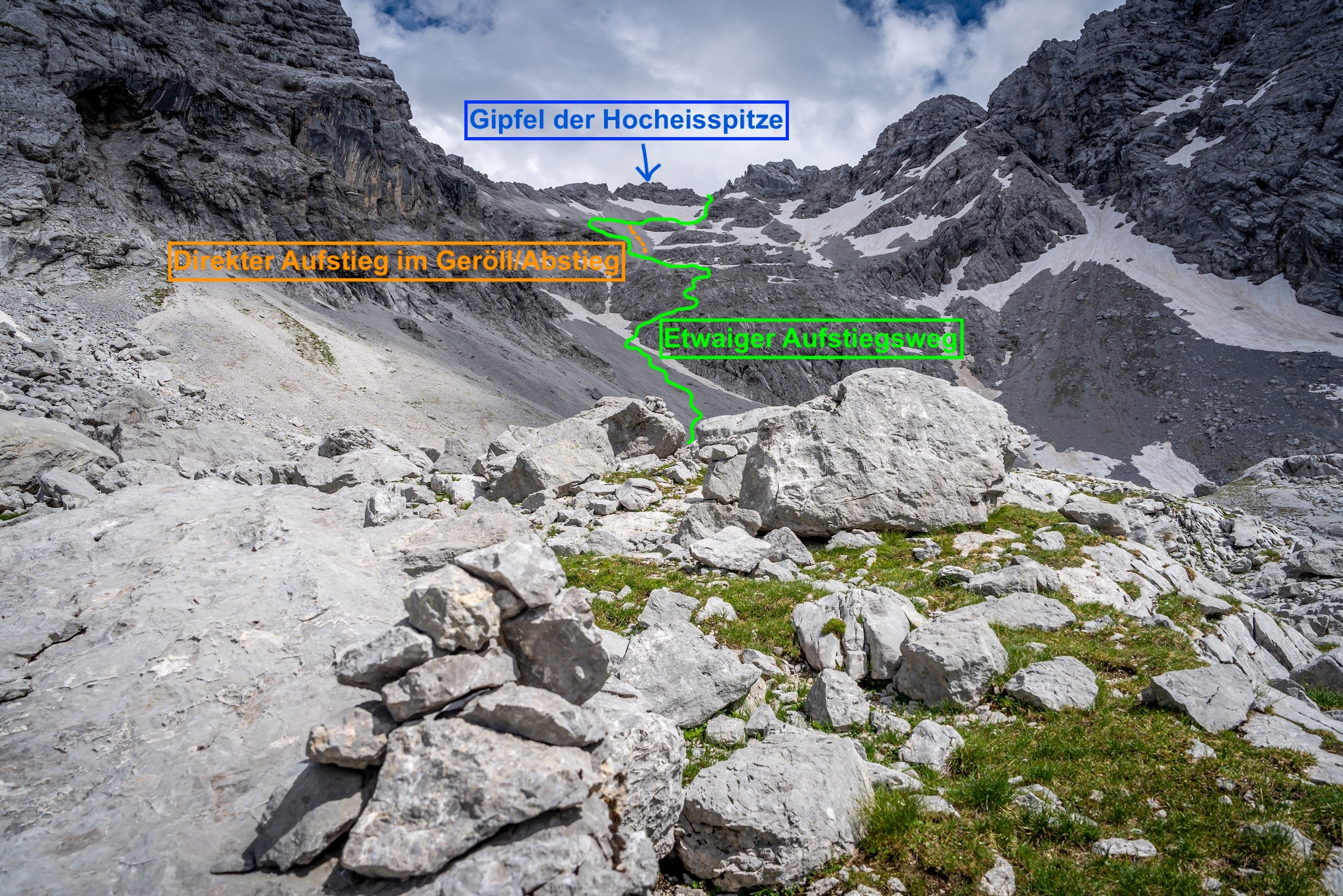 Das Schneefeld direkt unter dem Gipfelaufbau der Hocheisspitze wird wenn nötig an einer günstigen Stelle gequert und schließlich auf der rechten Seite umgangen und mühsam geht es im bröckeligen Fels- und Schuttgelände bis in die markante Scharte zwischen Hocheisspitze und Hocheiskopf (2.495 m).