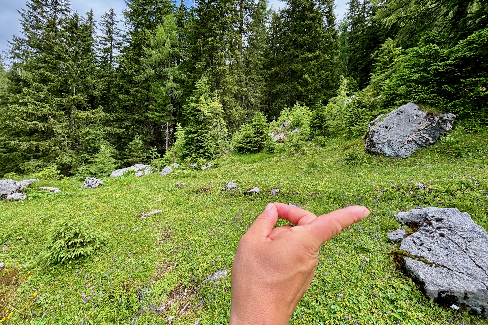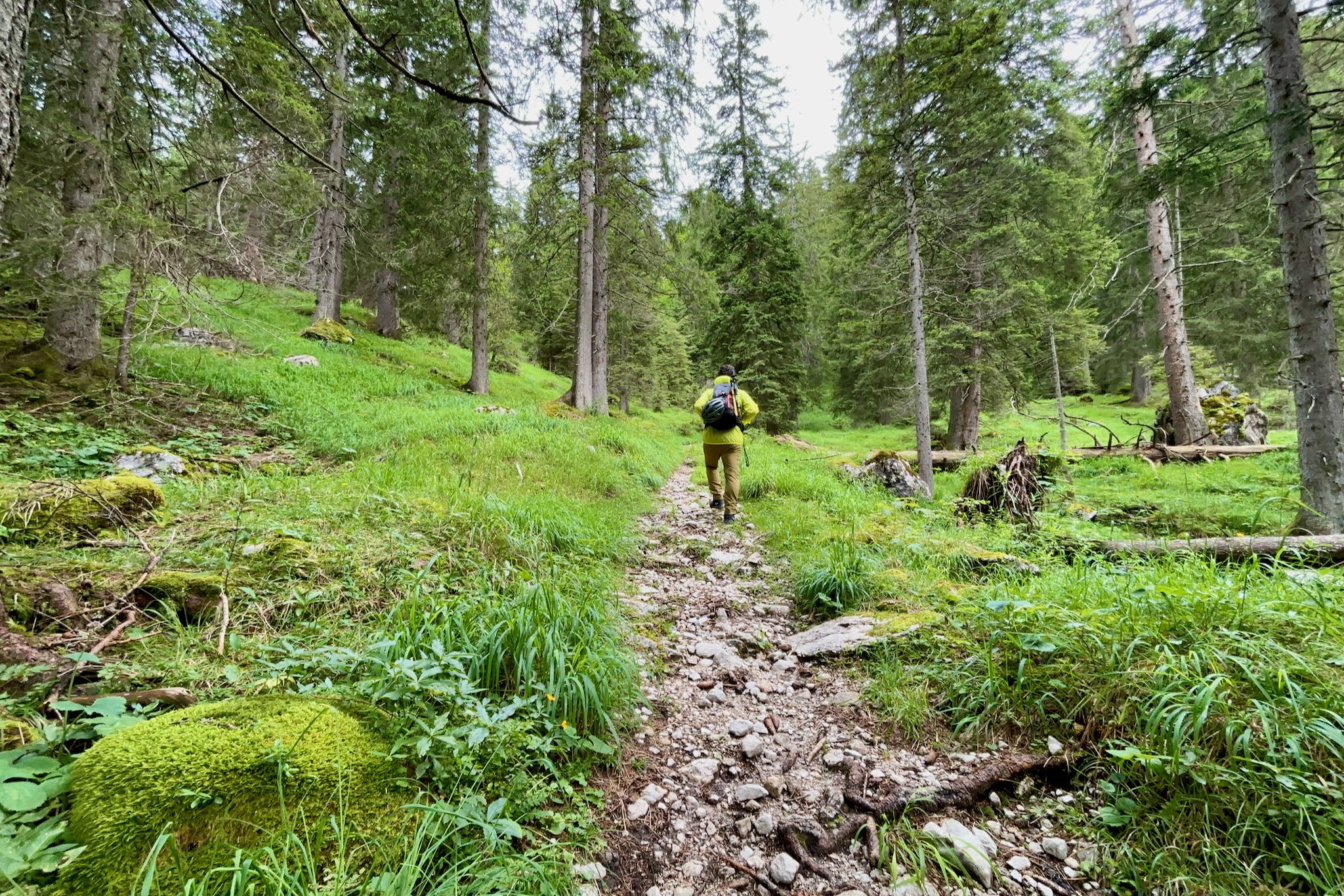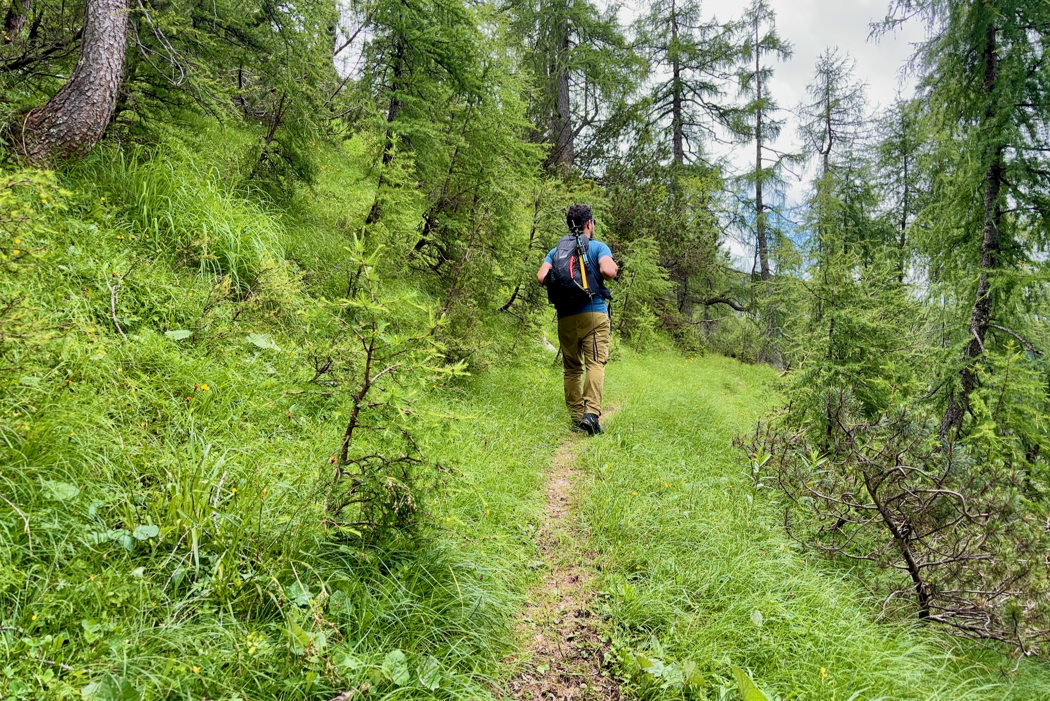 Im Wald geht es nun relativ sanft bergan. Riesige Felsblöcke liegen im lichter werdenden Lärchenwald, die von der Vergänglichkeit der Berge zeugen. Im Juni und Juli säumen blühende Almrosen den Waldboden und mit etwas Glück lassen sich Birkhühner aus nächster Nähe beobachten.