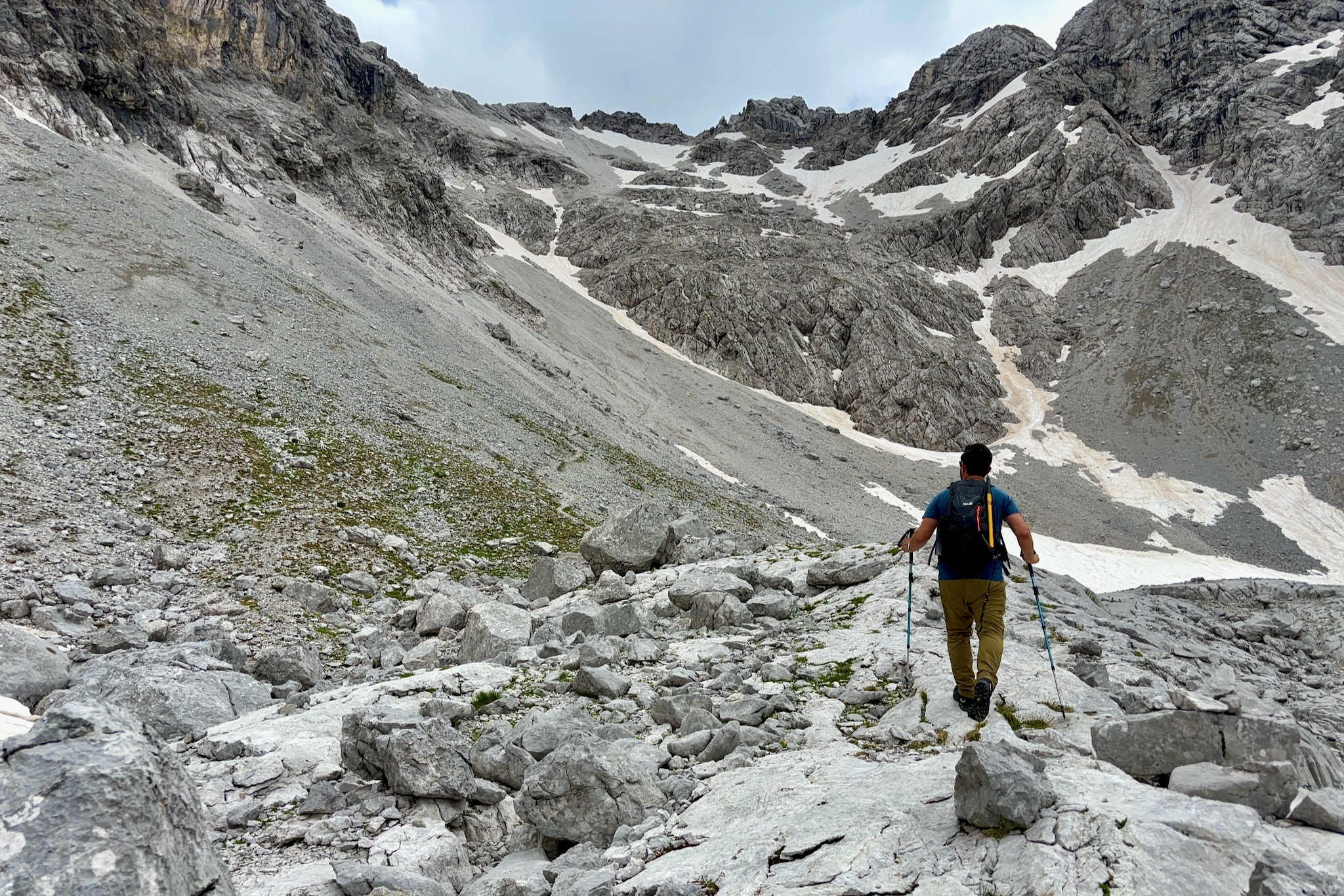Sobald es im Hocheiskar ansteilt, verschwindet der Steig mehr und mehr. Der Aufstieg folgt nun grob dem Verlauf einer Rinne, in der lang im Sommer noch Schnee liegen kann. Wir queren die Rinne an einer günstigen Stelle, um auf der rechten Seite im etwas felsigeren Gelände mit deutlich besserem Halt einen Weg nach oben zu suchen. Ab und an lassen sich hier ein paar Steinmänner entdecken. Ganz selten sogar mal eine rote Markierung oder zumindest ihre Reste.