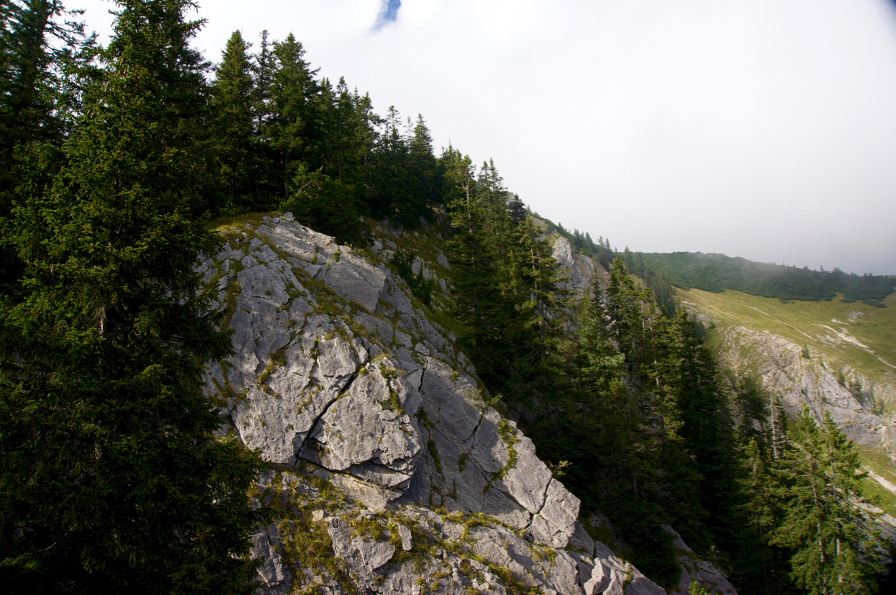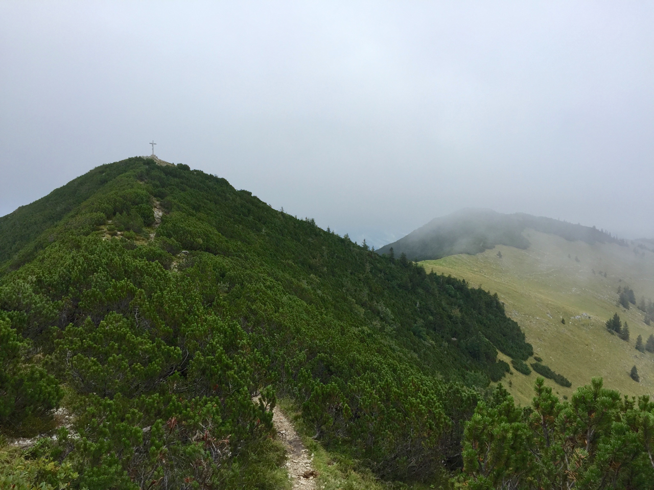 In südlicher Richtung folgen wir nun dem Gratverlauf ohne groß an Höhe zu verlieren und nach wenigen Minuten schon zweigt links ein unmarkierter, “vergessener” Steig ab. Der windet sich recht steil hinab und gibt immer wieder Tiefblicke gen Oberer Schönfeldalm preis. Unten in der Scharte angekommen, geht es kurz nochmal steil zu dem windschiefen Gipfelkreuz der Wilden Fräulein auf 1.615 m. Es lohnt sich, den schmalen Grat noch ein wenig weiter zu gehen und von dort den Blick auf den friedlich im Tal liegenden Spitzingsee zu genießen.