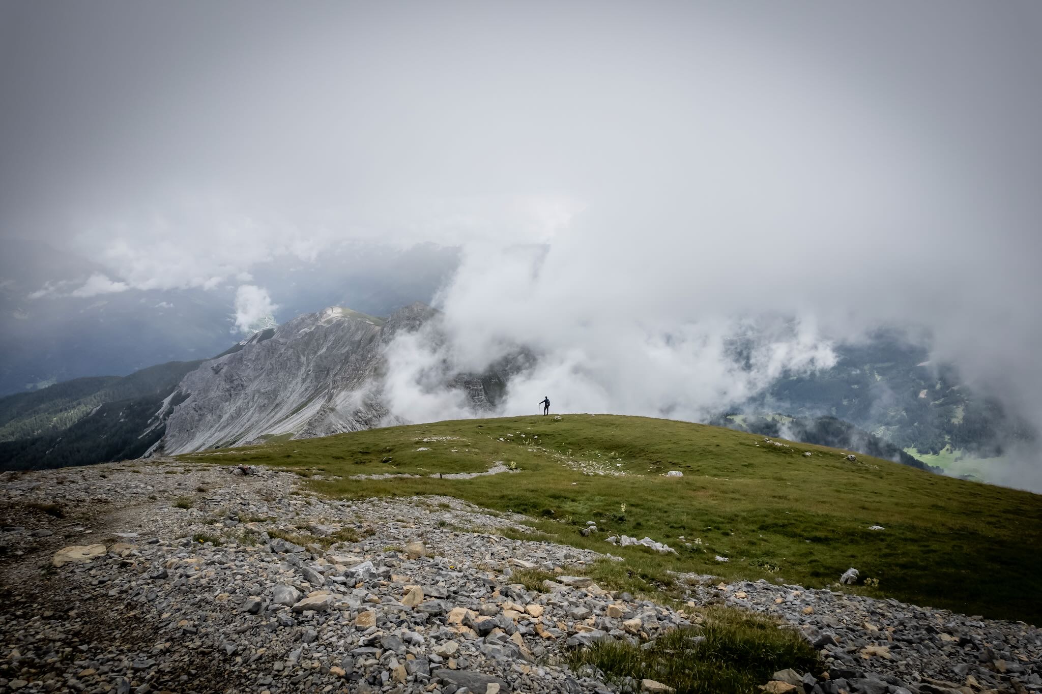 Nach knapp 200 knackigen Höhenmetern ist der Gipfel des Foppmandls (2.412 m) schnell erreicht. Während das Padasterjochhaus unten im Nebel verschwindet, schält sich immer wieder der Grat hinüber zur Wasenwand heraus. Links und rechts vom steil abfallenden Kamm windet sich der trotzdem weitestgehend einfache Weg bis unter den Schlussanstieg zur Wasenwand (2.563 m).