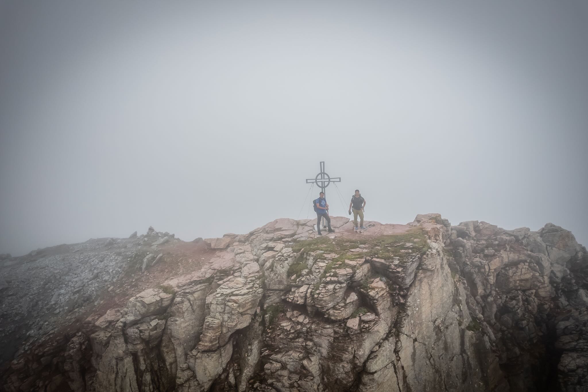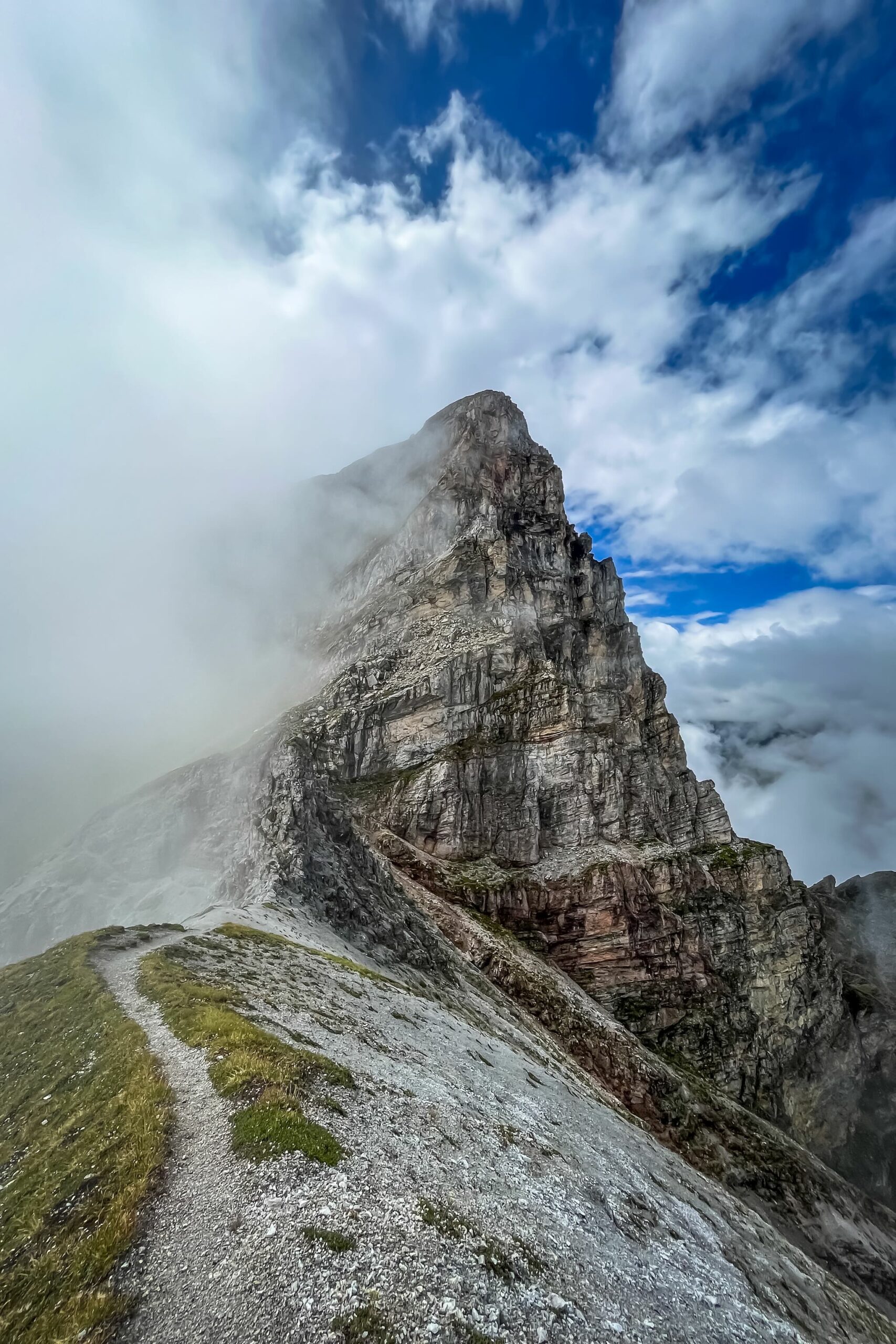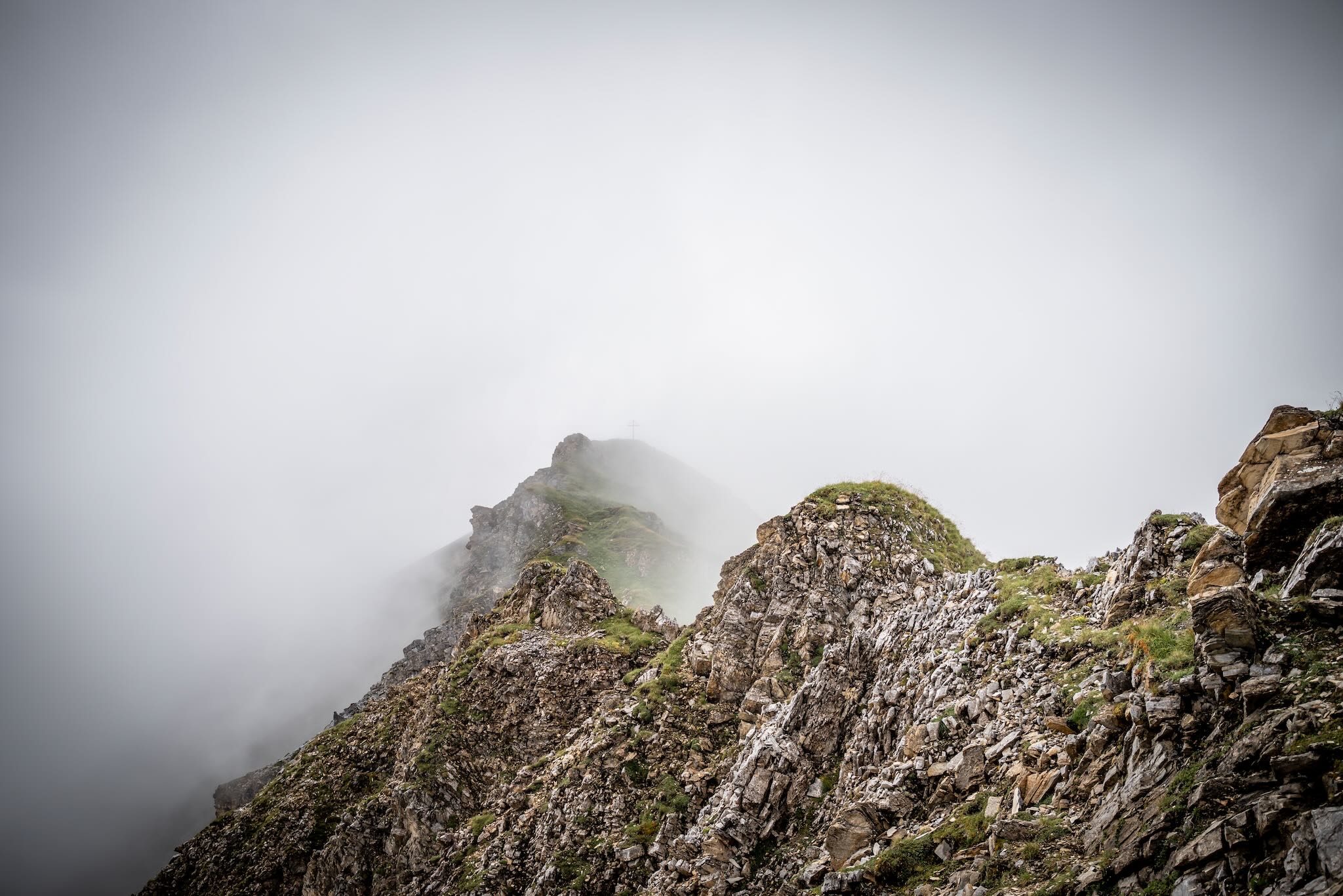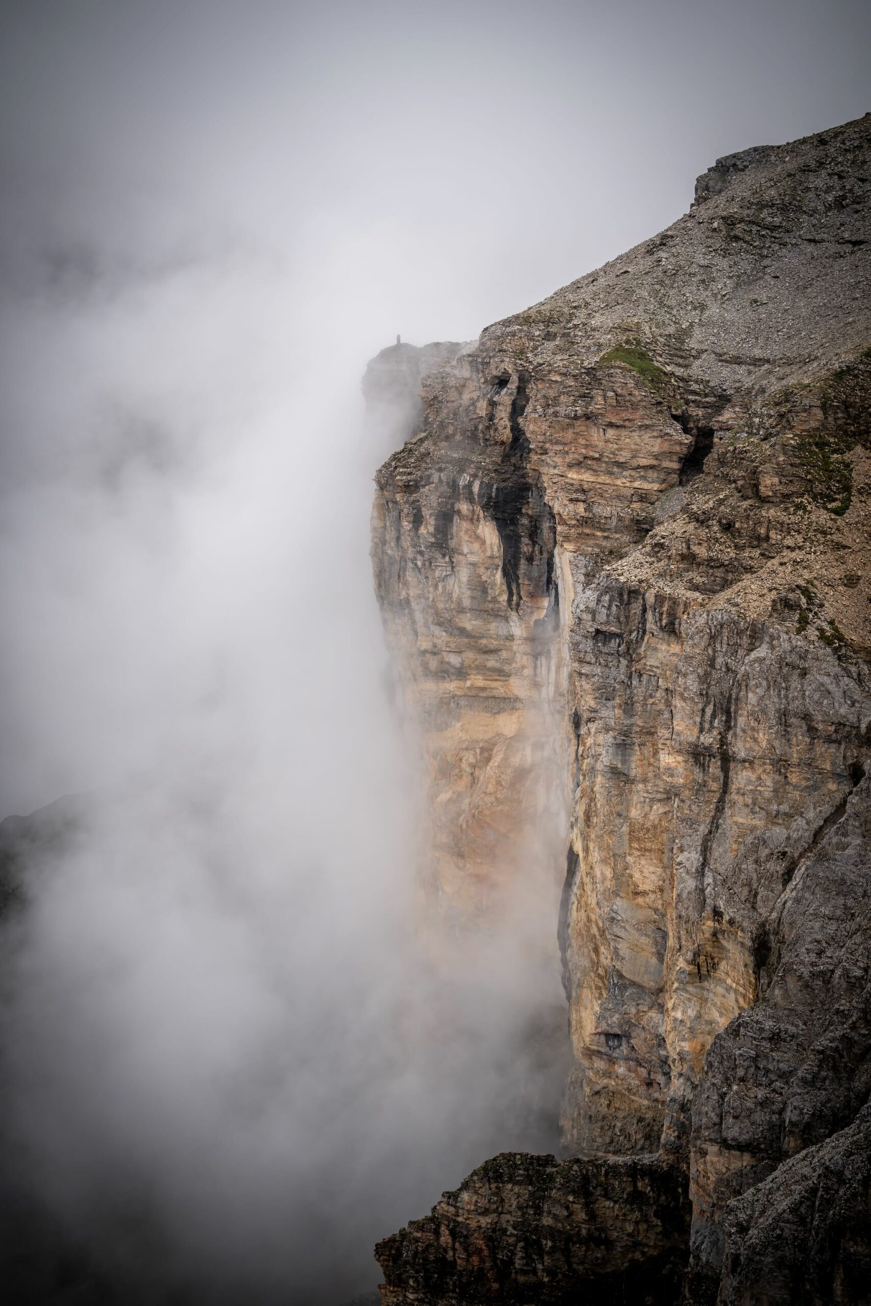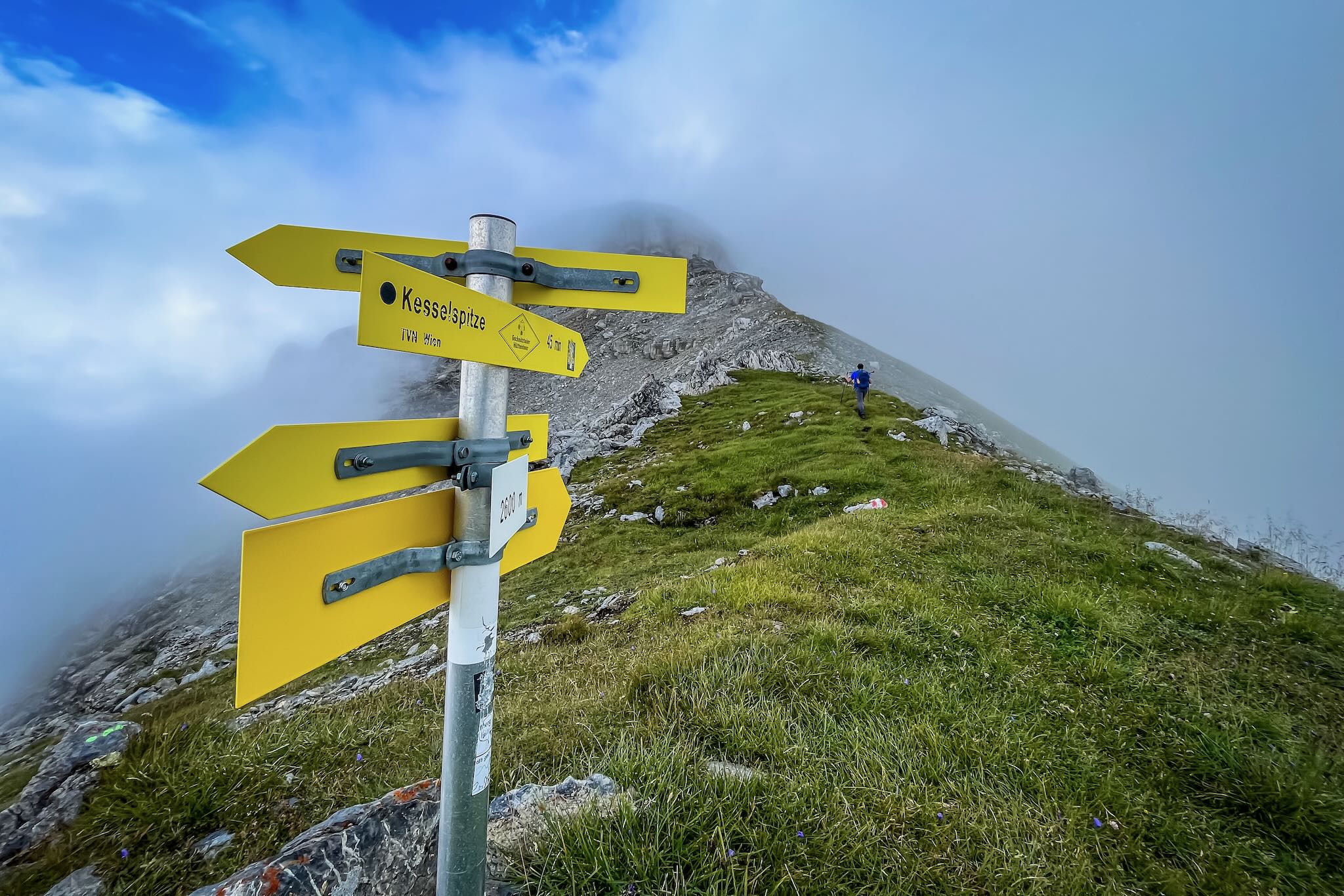 Der weitere Aufstieg führt nun weitestgehend einfach auf die Kesselspitze zu, die immer wieder kurz zwischen den Wolkenfetzen hindurch lugt, um kurz darauf wieder zu verschwinden. Ein atemberaubendes Schauspiel wie sich die Schwaden an den steil aufragenden Felswänden nach oben bewegen und so für ein beeindruckendes Lichtspiel sorgen.