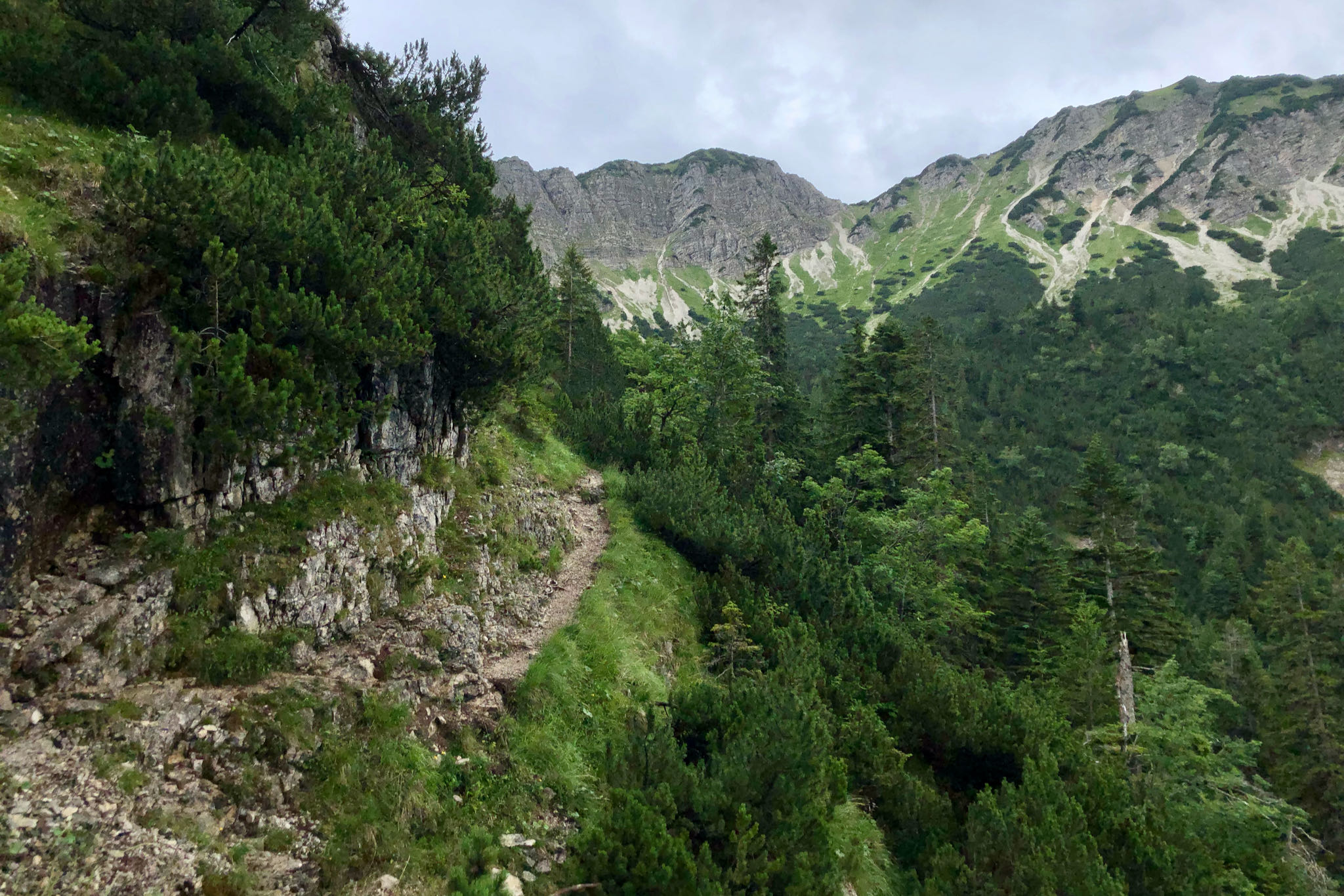 Der Abstieg von der Notkarspitze führt uns nicht auf selbem Weg zurück, sondern über die deutlich anspruchsvollere Nordseite. Hierfür steigen wir zunächst in die weiten Kare ab. Schließlich queren wir samt kleinen Gegenanstiegen und mit Drahtseil versicherten Passagen die Nordhänge der Ausläufer der Ziegelspitz, um schließlich über einen sehr steilen und nach Regenfällen unangenehm glitschigen Steig weiter abzusteigen. Etwa 1,5 Stunden nach Aufbruch vom Gipfel der Notkarspitze erreichen wir das Tal, um dort am Waldrand in knapp 45 Minuten zurück zum Ettaler Sattel zu wandern, nicht aber ohne einen Abstecher zum Kloster Ettal zu machen.