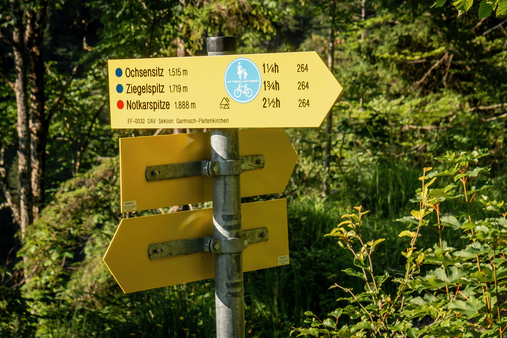 Unsere Wanderung auf die Notkarspitze starten wir noch vor den Toren Ettals, die prächtige Kuppel des Klosters ist bereits zu sehen, am Ettaler Sattel kurz nachdem der Mond spektakulär direkt hinter dem Gipfelkreuz der Ziegelspitz untergeht. Erst wenden wir uns nach links und wandern ein paar hundert Meter am Waldrand entlang. Am folgenden Wegweiser halten wir uns scharf rechts und schon die ersten Meter auf dem nun deutlich schmaleren und steinigeren Steig zeigen, wo die Reise bis zum Erreichen des ersten Gipfels hingeht.