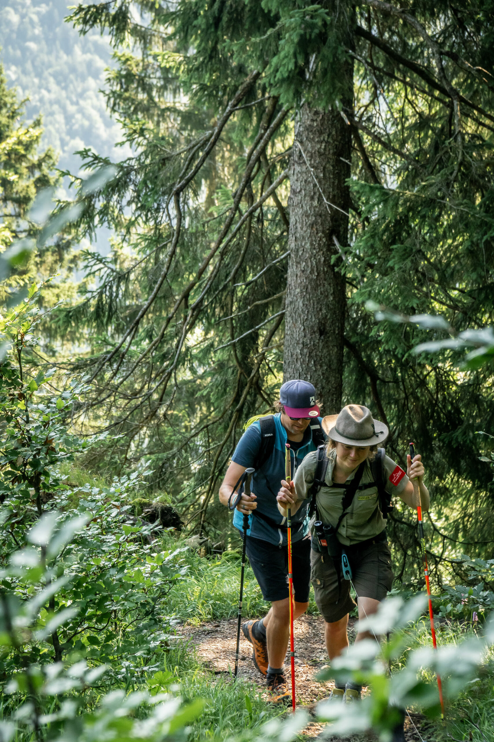 Steil windet sich der Pfad im dichten Wald hinauf und schnell überwinden wir Höhenmeter um Höhenmeter. Nur langsam ändert sich die Vegetation um uns herum während uns unsere Begleitung, Rangerin Deniz vom Naturpark Ammergauer Alpen, Einblicke in ihre spannende Arbeit gibt. So gilt es immer mal wieder einen quer auf dem Weg liegenden Baum zumindest an die Seite zu legen, schließlich sollen die Besucher des Naturparks auch auf den ausgewiesenen Wegen und Steigen gehalten werden, um die Natur möglichst wenig zu belasten.