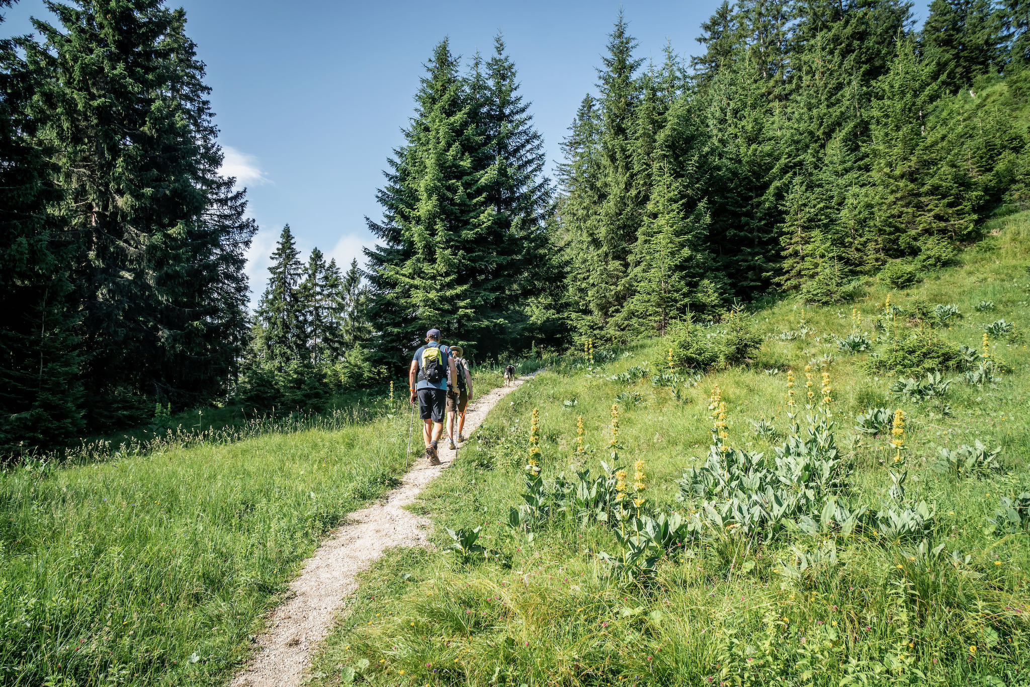 Bald erreichen wir eine Lichtung, auf der wir gelben Enzian entdecken. Die Wurzeln des gelben Enzians sind übrigens Grundlage des berühmten Enzianschnaps, der in der hauseigenen Klosterdestillerie allerdings nicht gebrannt wird. Auf der Lichtung erhaschen wir aber doch einen ersten Ausblick auf das Kloster mit seiner markanten Kuppel weit unten im Tal.