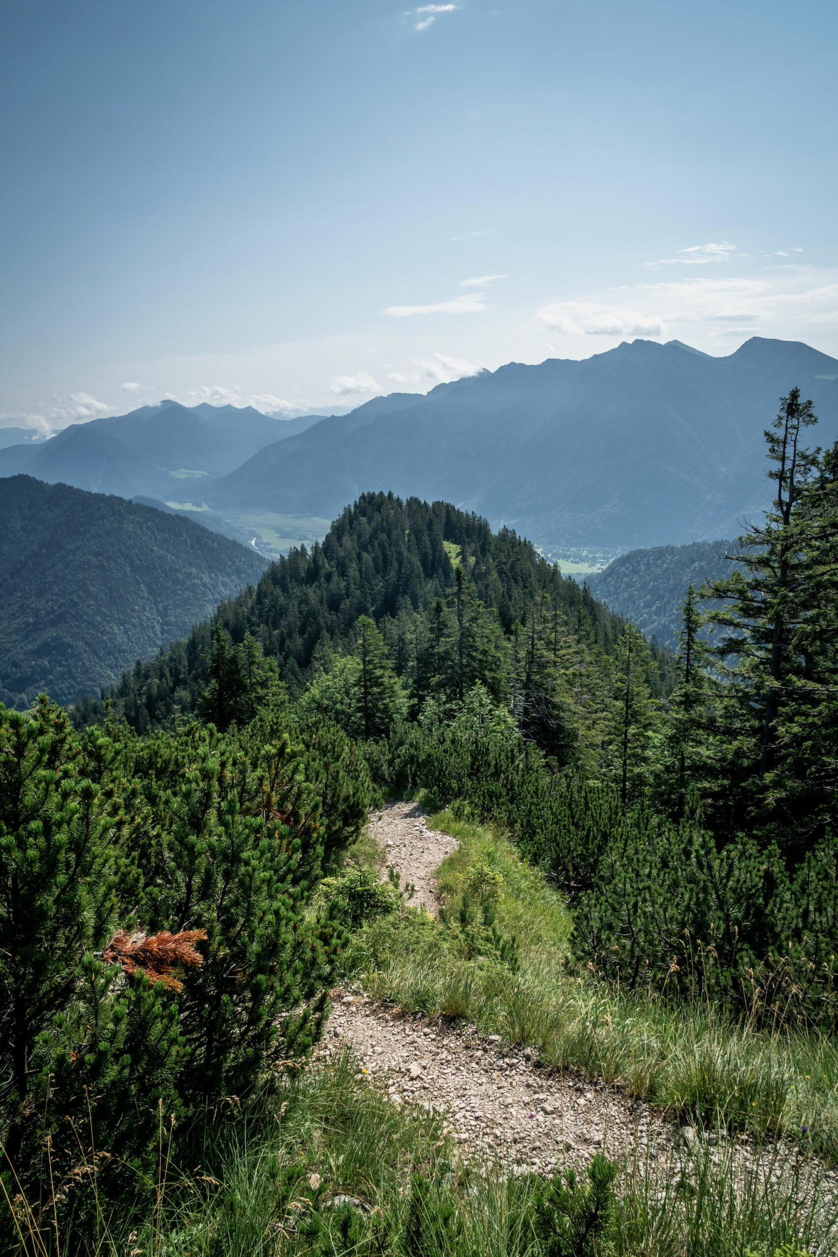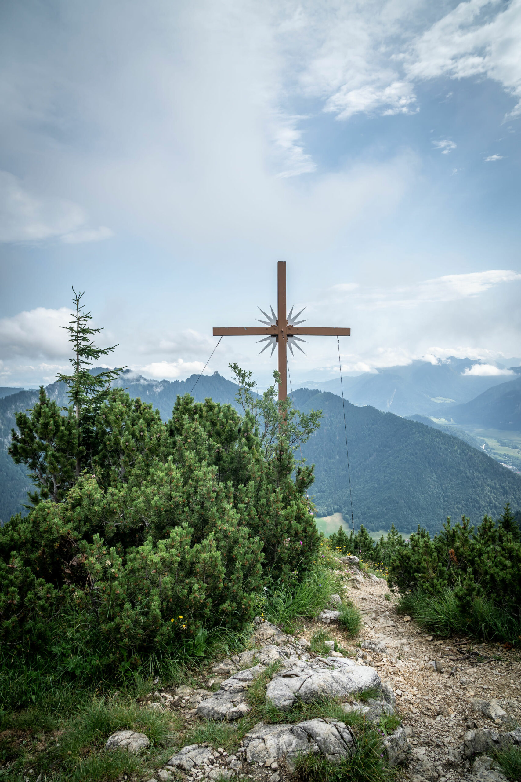 Kurz darauf zweigt ein beinahe unscheinbarer Pfad nach rechts ab während der Hauptweg auf der Nordseite des Kamms weiter geht. Der Abzweig führt auf den Gipfel des Ochsensitz (1.515 m). Den Abstecher zum Gipfelkreuz lassen wir uns natürlich nicht nehmen. Hinter dem Gipfelkreuz trifft der Abzweig bald schon wieder auf den Aufstiegsweg. Langsam lichten sich die Bäume um uns herum immer mehr und am letzten Anstieg zur Ziegelspitz säumen nur noch Latschen den Weg. Am zweiten Gipfel – der Ziegelspitz (1.719 m) haben wir den wohl schönsten Blick auf das von Ludwig dem Bayer gegründete Kloster.