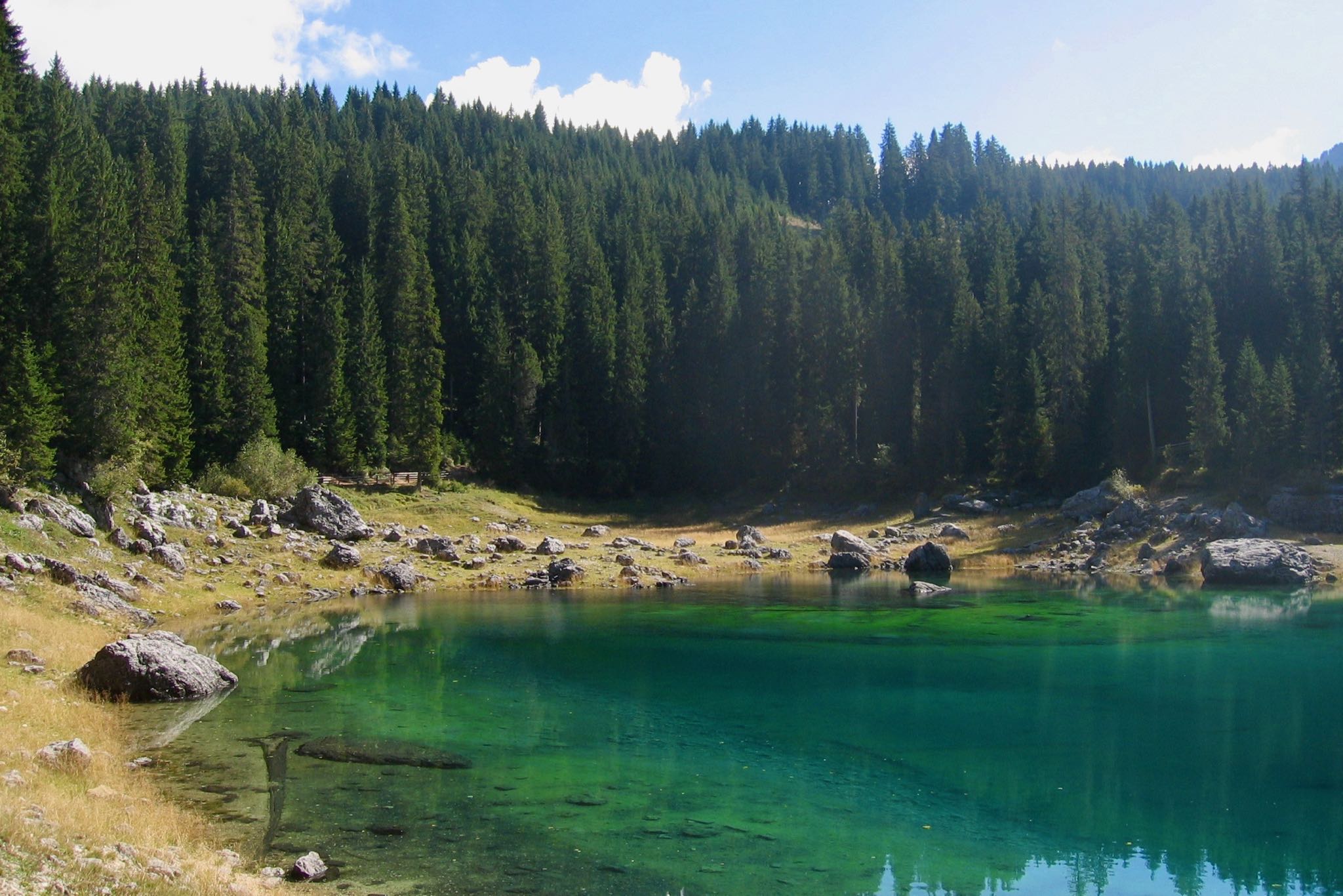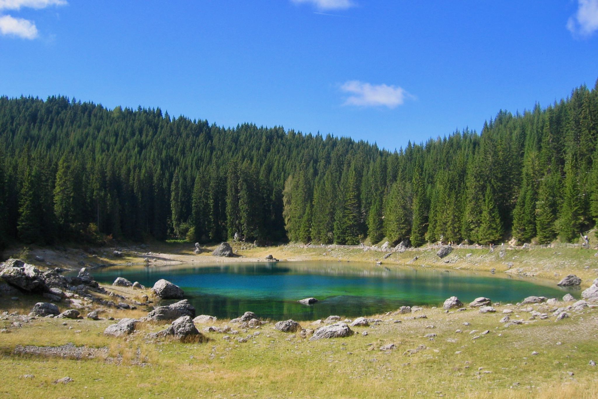 Das glasklare Wasser, in dem sich die Spitzen des Latemars spiegeln, entfaltet eine magische Anziehungskraft, die ihresgleichen sucht. Wer den Dolomiten einen Besuch abstattet, lässt den Karersee nicht aus.