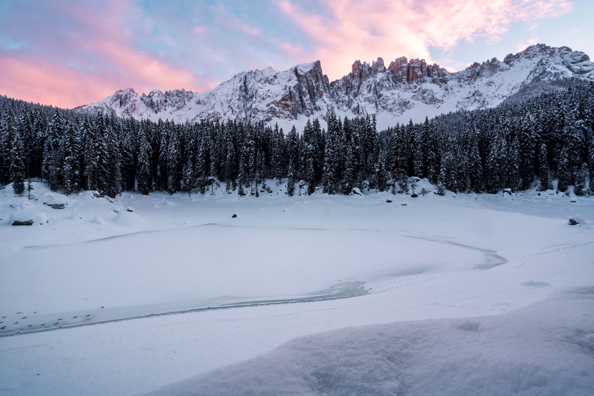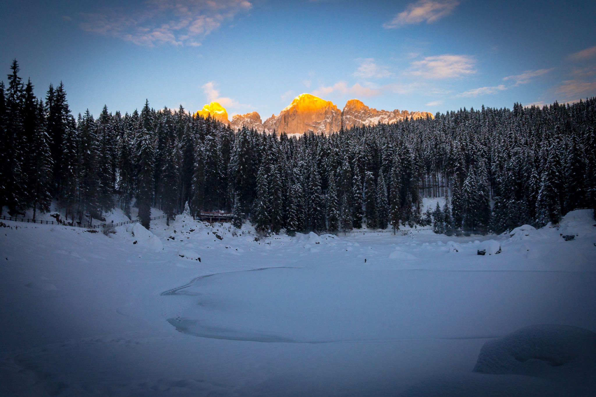 Der Karersee ist nicht ohne Grund eines der an Highlights reichen Dolomiten, auch wenn sein Charakter im Winter ein gänzlich anderer ist. Geradezu magisch sind die Momente rund um den frühen Morgen und frühen Abend, wenn die Sonne auf- beziehungsweise untergeht und die Bergspitzen orangerot leuchten.