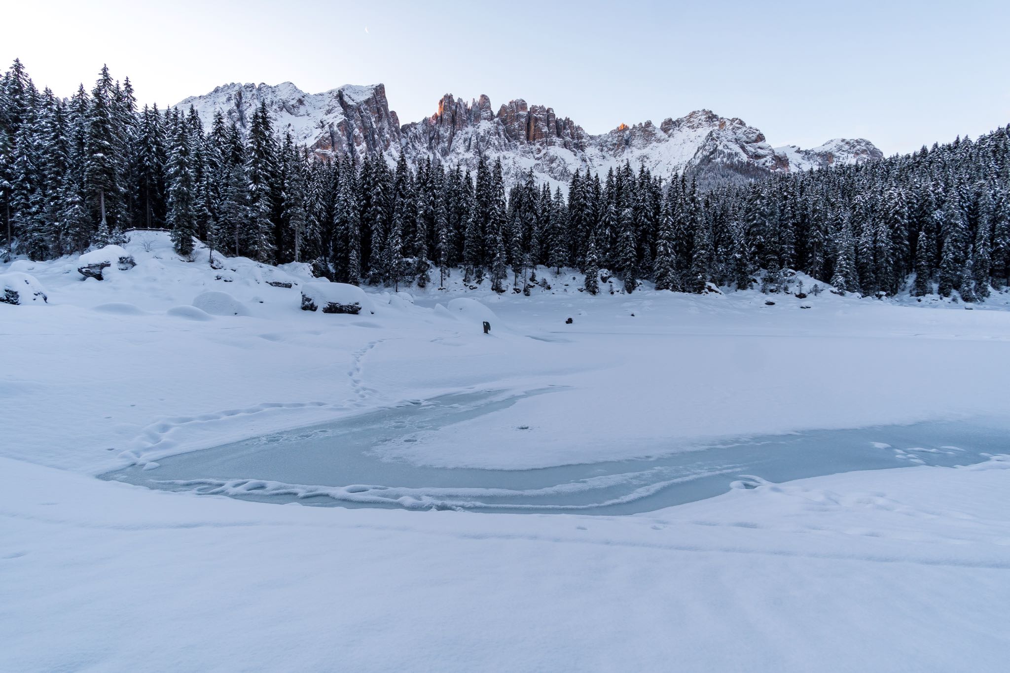 Im Winter sieht das anders aus. Weder strömen die Touristenmassen aus den Reisebussen zum und um den Karersee, noch wird man Zeuge der satten Grüntöne. Ab November verschwinden die nämlich unter einer dicken Eisschicht, die oft bis weit in den Frühling hinein bestehen bleibt. Bei einer Seehöhe von 1.520 Meter nicht weiter verwunderlich.