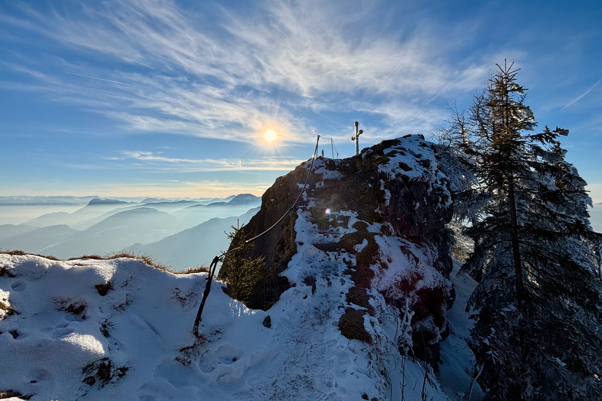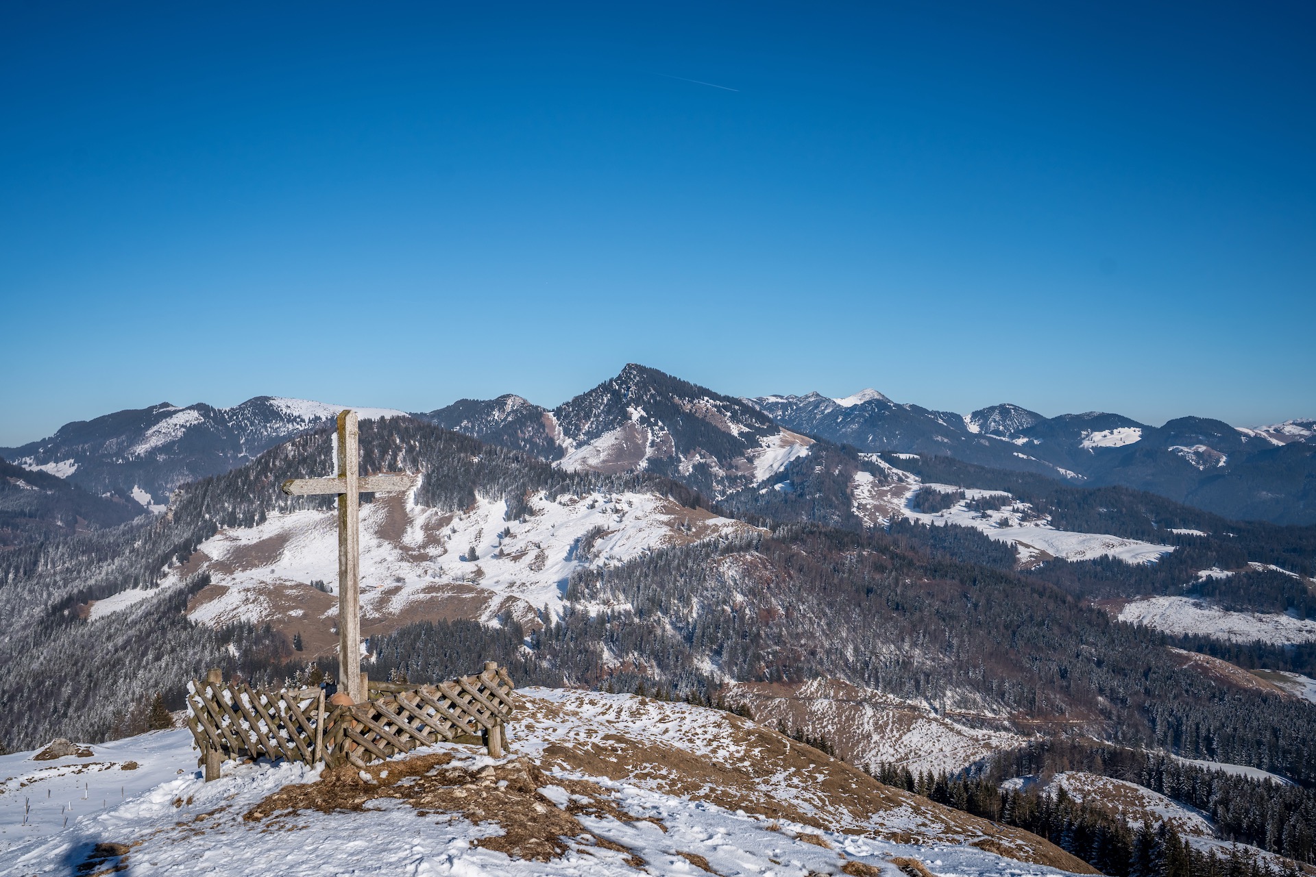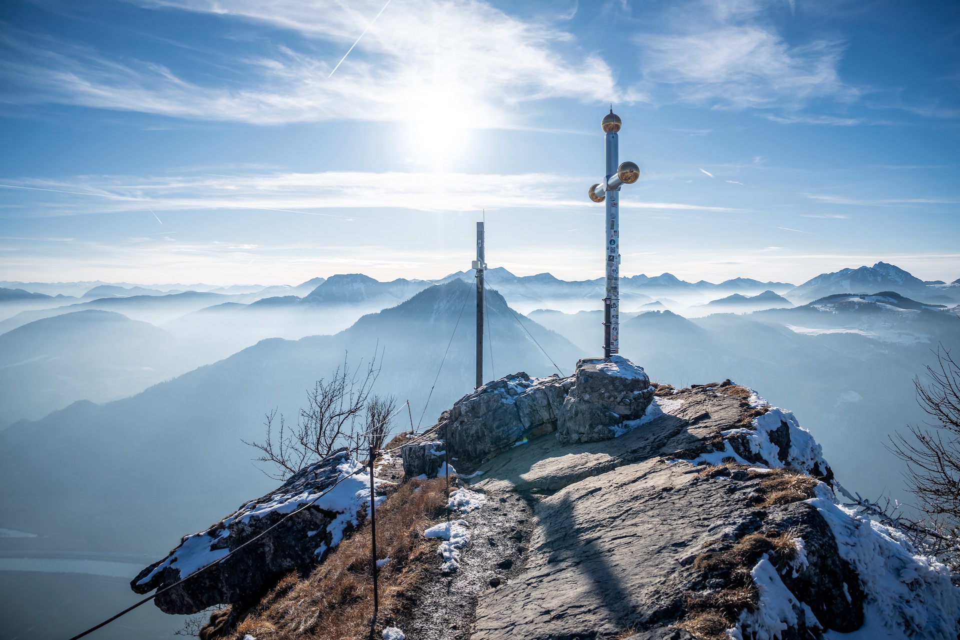 Das Kranzhorn ist ein markanter Berg hoch über dem Inntal mit einer seltenen Besonderheit: Es besitzt zwei Gipfelkreuze. Diese gehen auf die Grenze zwischen Bayern und Tirol zurück, die genau über den Gipfel verläuft und bereits 1504 festgelegt wurde. Die beiden Gipfelkreuze – eins für Bayern, eins für Tirol – sind so nicht nur ein Symbol dieser Trennlinie, sondern auch ein Zeichen der Verbundenheit, schließlich teilen sich beide Länder nicht nur den grandiosen Blick hinab ins Inntal und weit darüber hinaus.