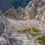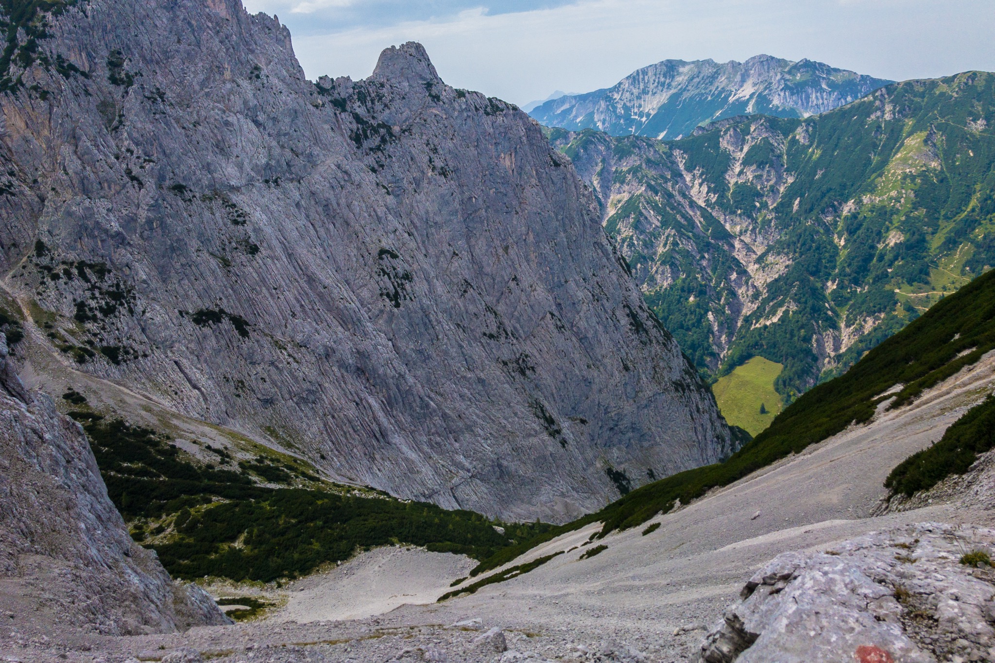 Nun trifft man wieder auf den Aufstiegsweg und gelangt nach kurzer Zeit zurück ins Schuttkar. So fühlt sich das wohl an, wenn gegen einen Castor-Transport demonstriert wird, denke ich mir, als ich im losen Schotter abfahre. Am Ende des Kars hält sich links, wer nicht über den Aufstiegsweg absteigen möchte. Nun geht es gemächlicher weiter. Ein sanfter Steig führt zu den bedrohlichen Wänden unterhalb der Ackerlspitze und in die markante Scharte zwischen Kleinkaiser und Mitterkaiser.