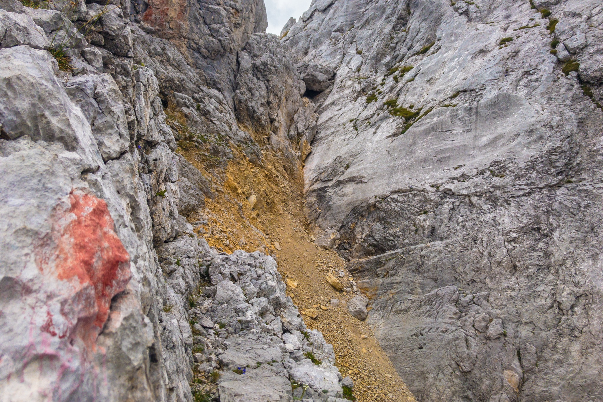 Die rote Markierung verrät, dass es trotzdem dort entlang geht. Die Spuren des Stahlseils, das hier mal angebracht war, sind noch sichtbar. Auch ohne das geht es mit guten Griffen und guten Tritten, aber recht ausgesetzt abwärts. Ein sicheres Klettern im mindestens 2. Schwierigkeitsgrad und eine Portion Ruhe sollte man dabei haben.