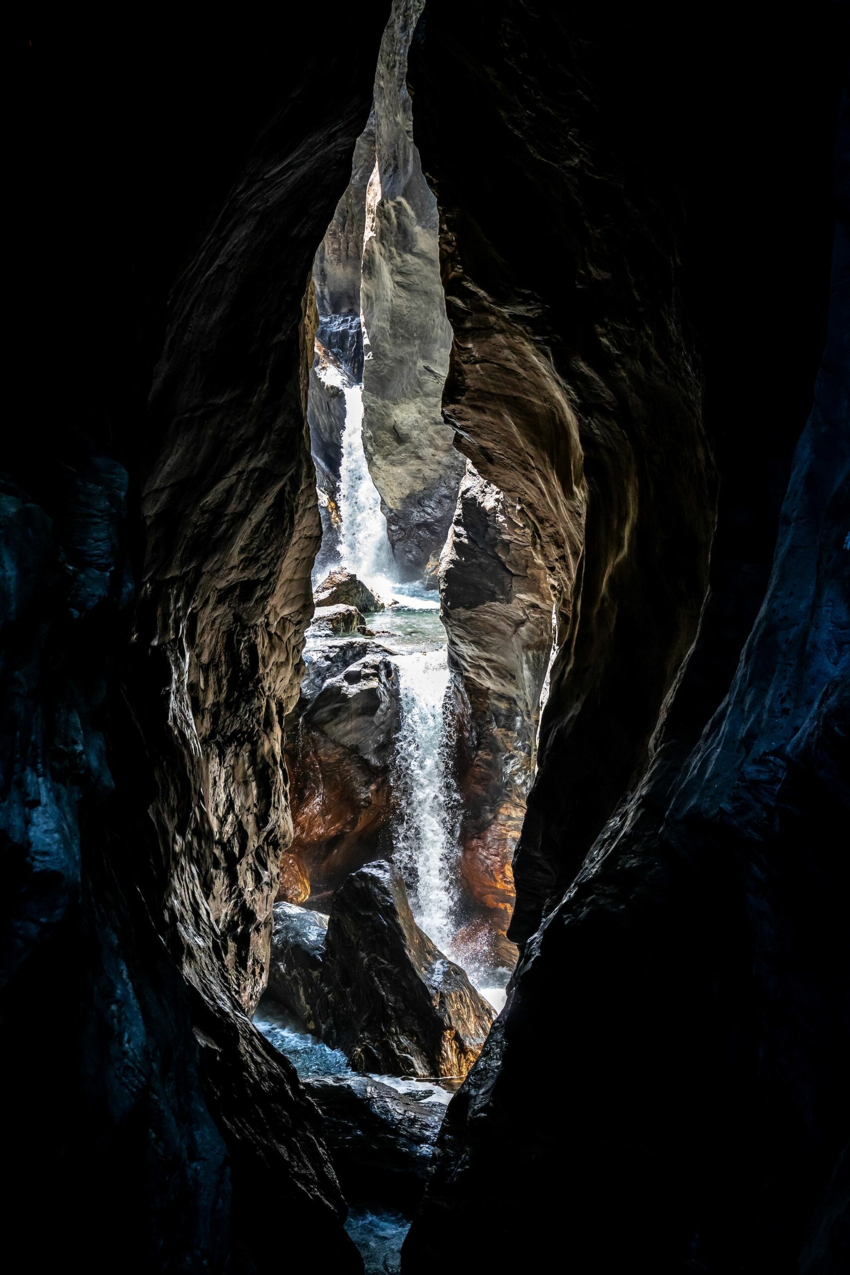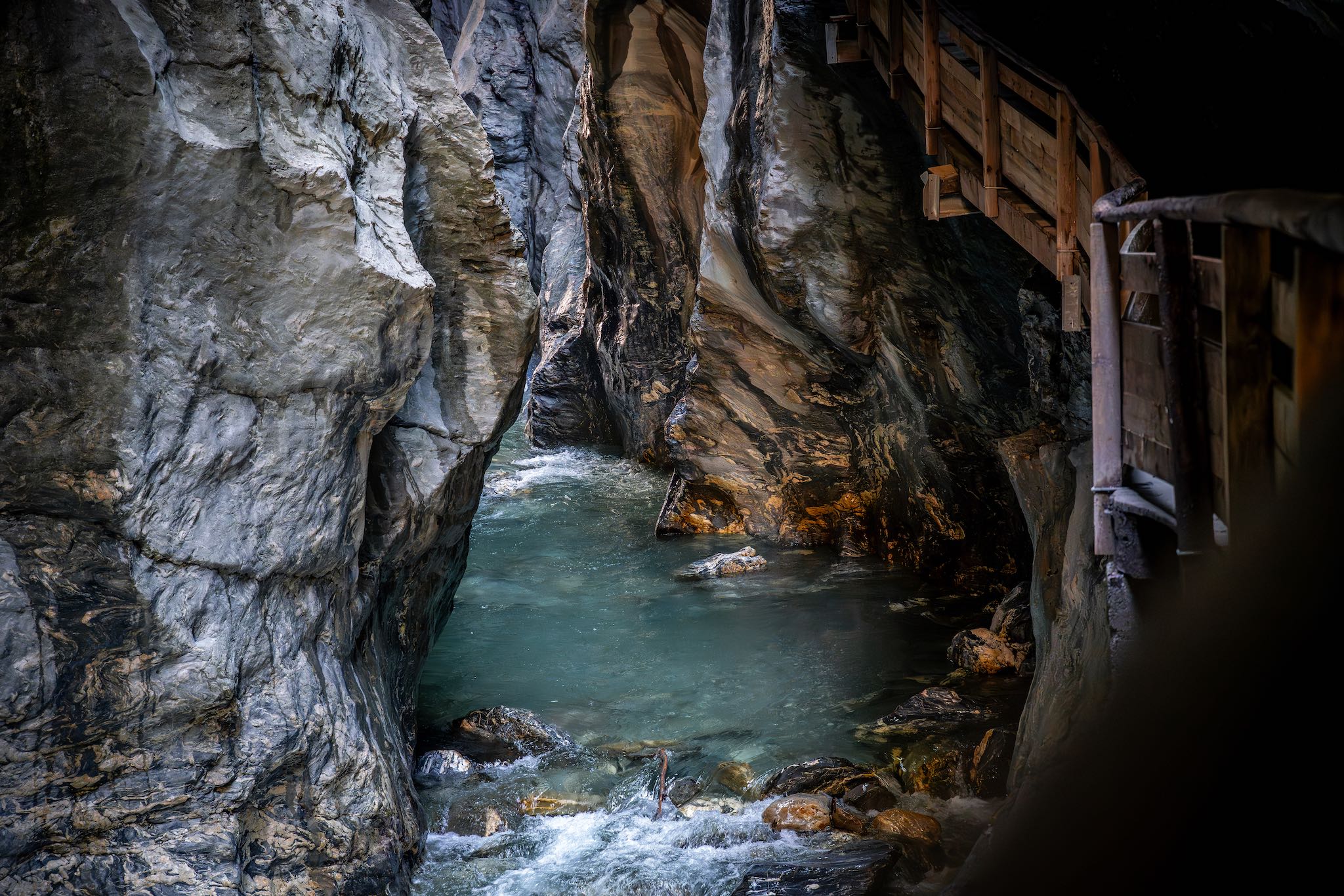 Unten angekommen, verengt sich die Schlucht dramatisch. Nur wenige Meter ist die Liechtensteinklamm hier breit, die Felsen ragen bis weit hinauf und kaum Licht dringt bis unten. Auf Holzstegen und in den Fels gesprengten Wegen dringen wir immer tiefer in die Schlucht vor. Eine Brücke führt wieder über dem tosenden Wasser wieder auf die andere Seite und tief in den Berg.