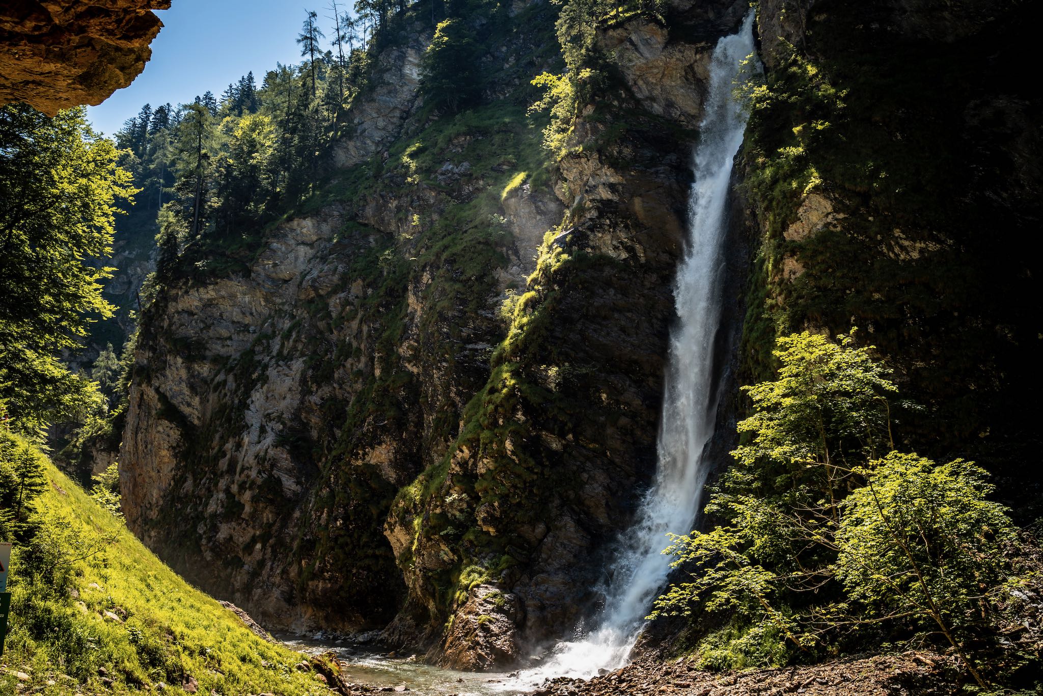 Hier steilt der Weg gehörig an und als wir wieder das Tageslicht erblicken, ist das Ende des ausgebauten Weges durch die Klamm fast erreicht. Nach vielen kleinen Wasserfällen bildet ein großer, knapp 30 Meter hoher Wasserfall den Schlusspunkt der Tour durch die Liechtensteinklamm. Von hier geht es auf dem gleichen Weg zurück zum Ausgangspunkt.