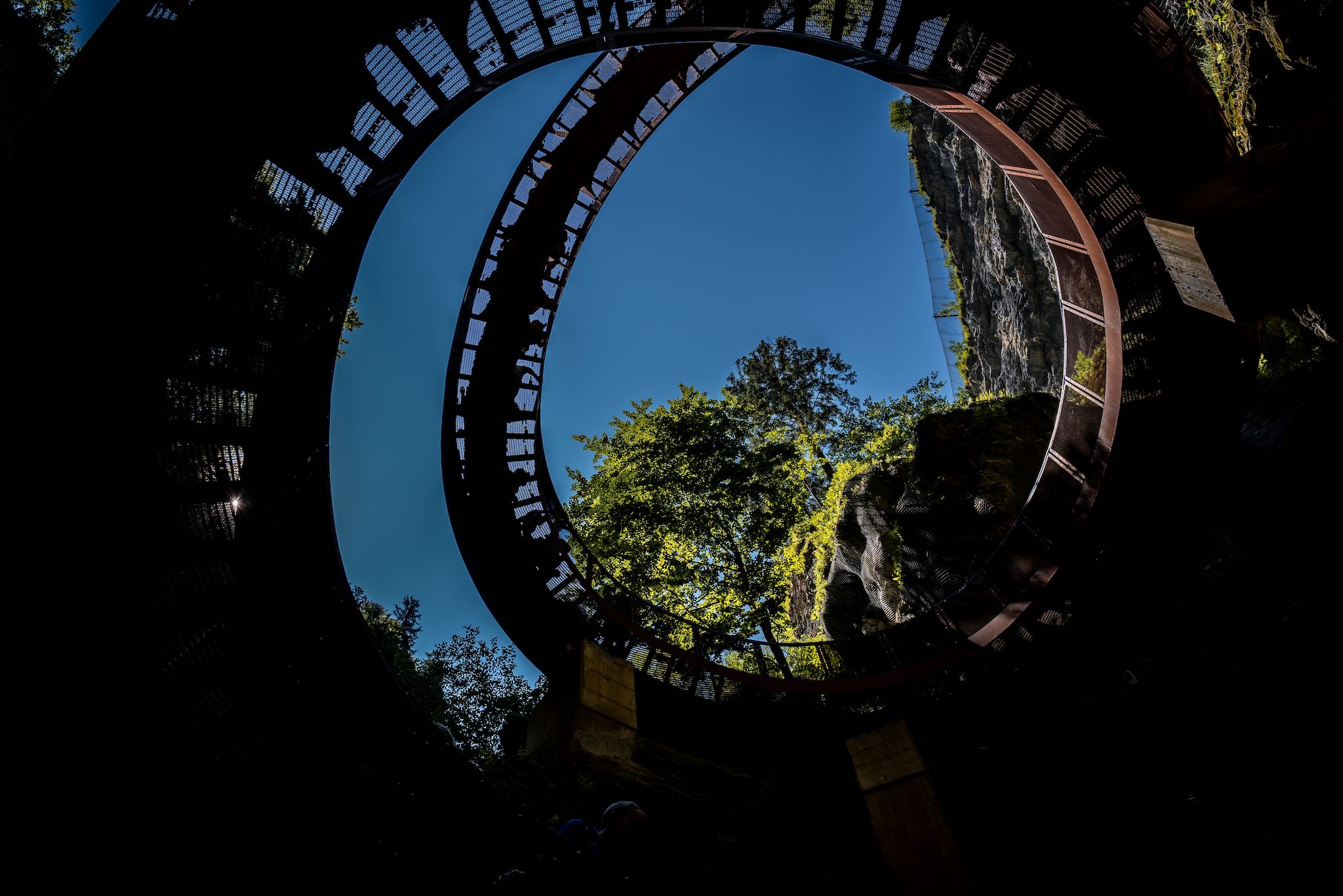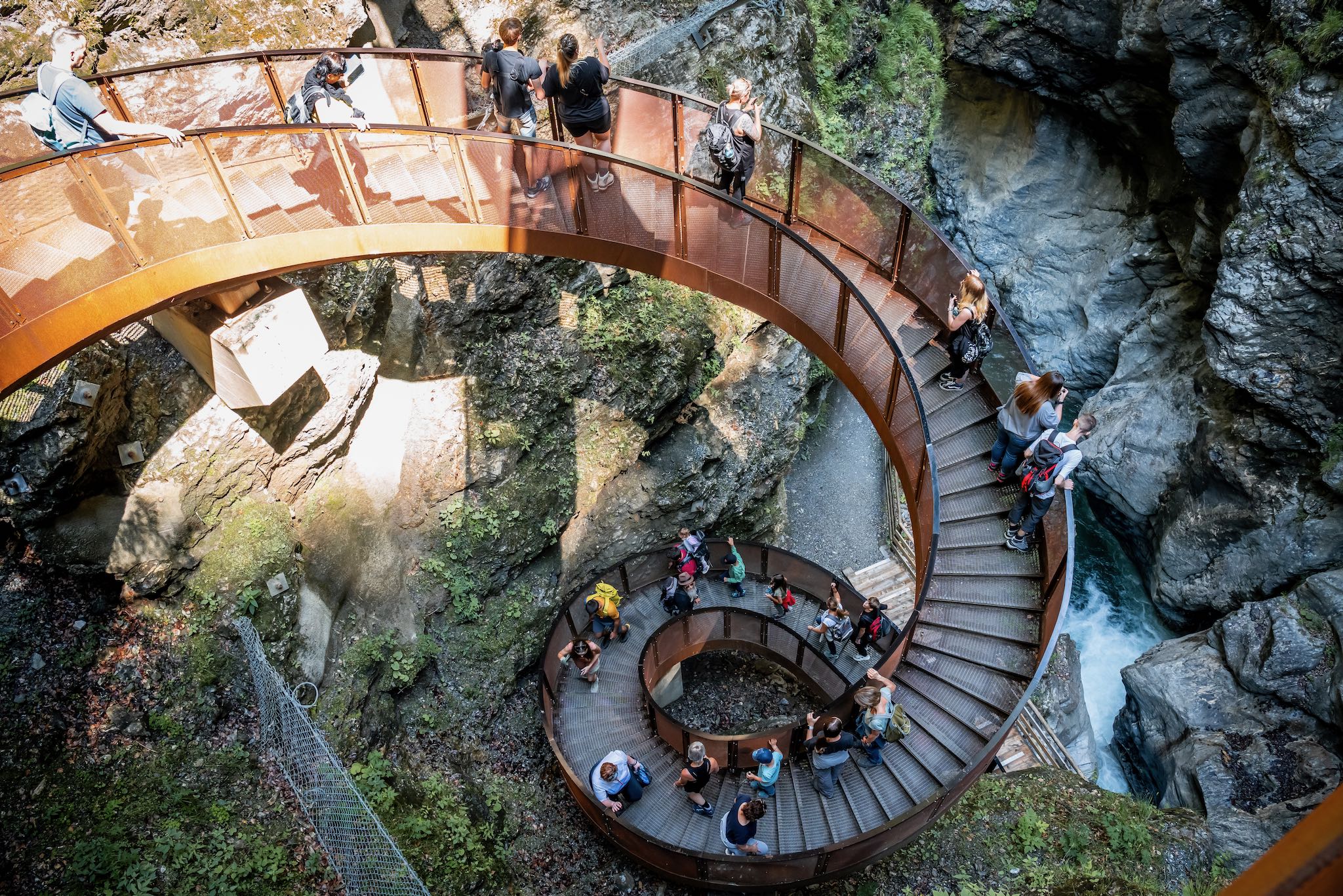 Nachdem sich der Wanderweg erst in den Fels hinein und später weiter nach oben gewunden hat, erreichen wir eines der Highlights der Liechtensteinklamm. Die Helix, so der Name der spektakulären Wendeltreppe, windet sich in mehreren Runden nach unten und tief in die Klamm hinab.