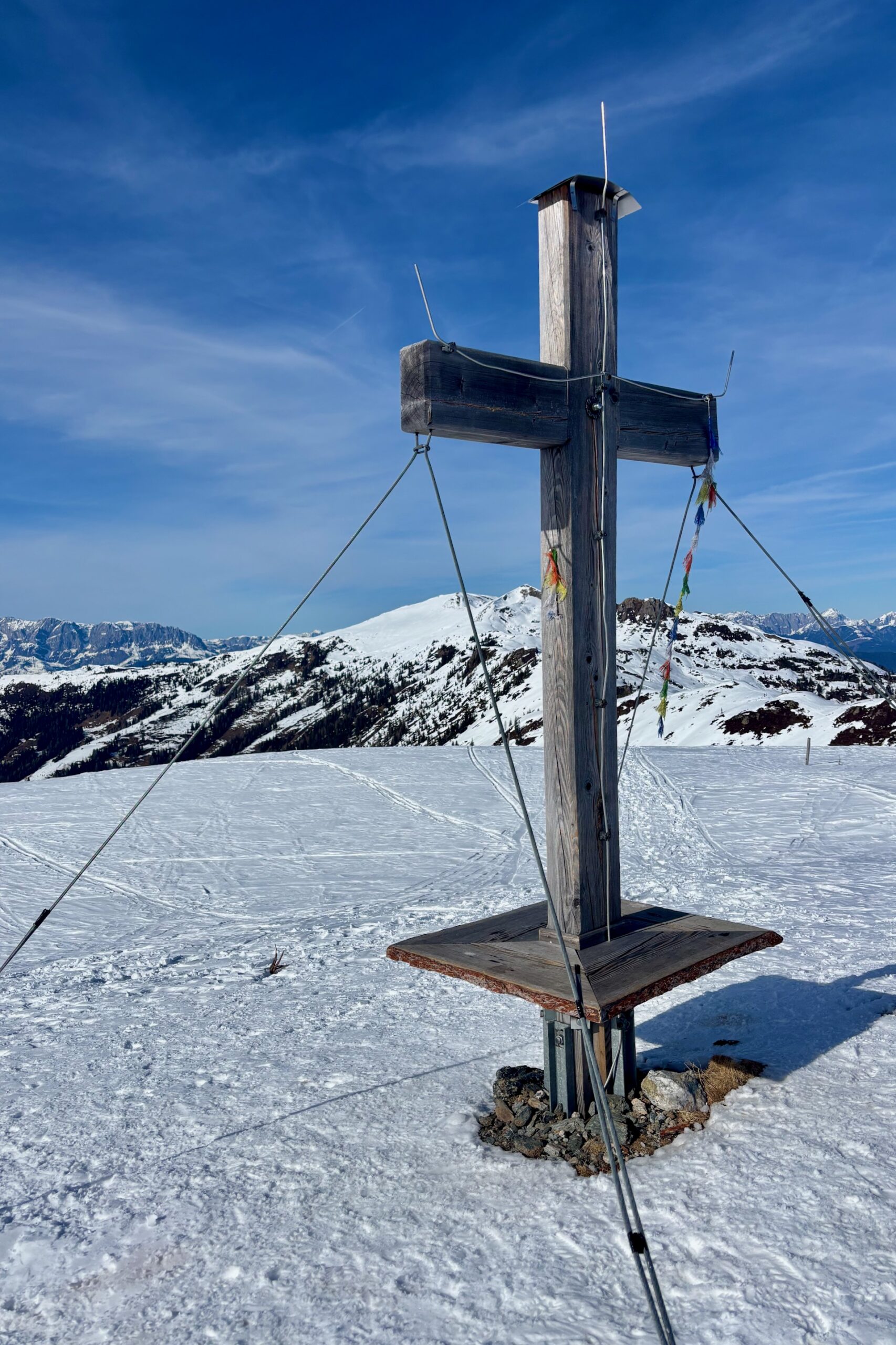 Kurz bevor wir die Alm erreichen, biegen wir rechts auf die weiten Hänge ab und steigen mäßig steil im freien Gelände weiter auf , halten uns aber von den exponierteren Hängen, die zur Achtalm hinabfallen, fern. Die letzten Meter führen über einen breiten Rücken zum Gipfel des Loosbühels auf 2.043 m. Vom Gipfel blicken wir zurück ins Ellmautal und hinüber zum Frauenkogel und Gamskarkogel auf der anderen Talseite und bis in die Hohen Tauern im Süden.