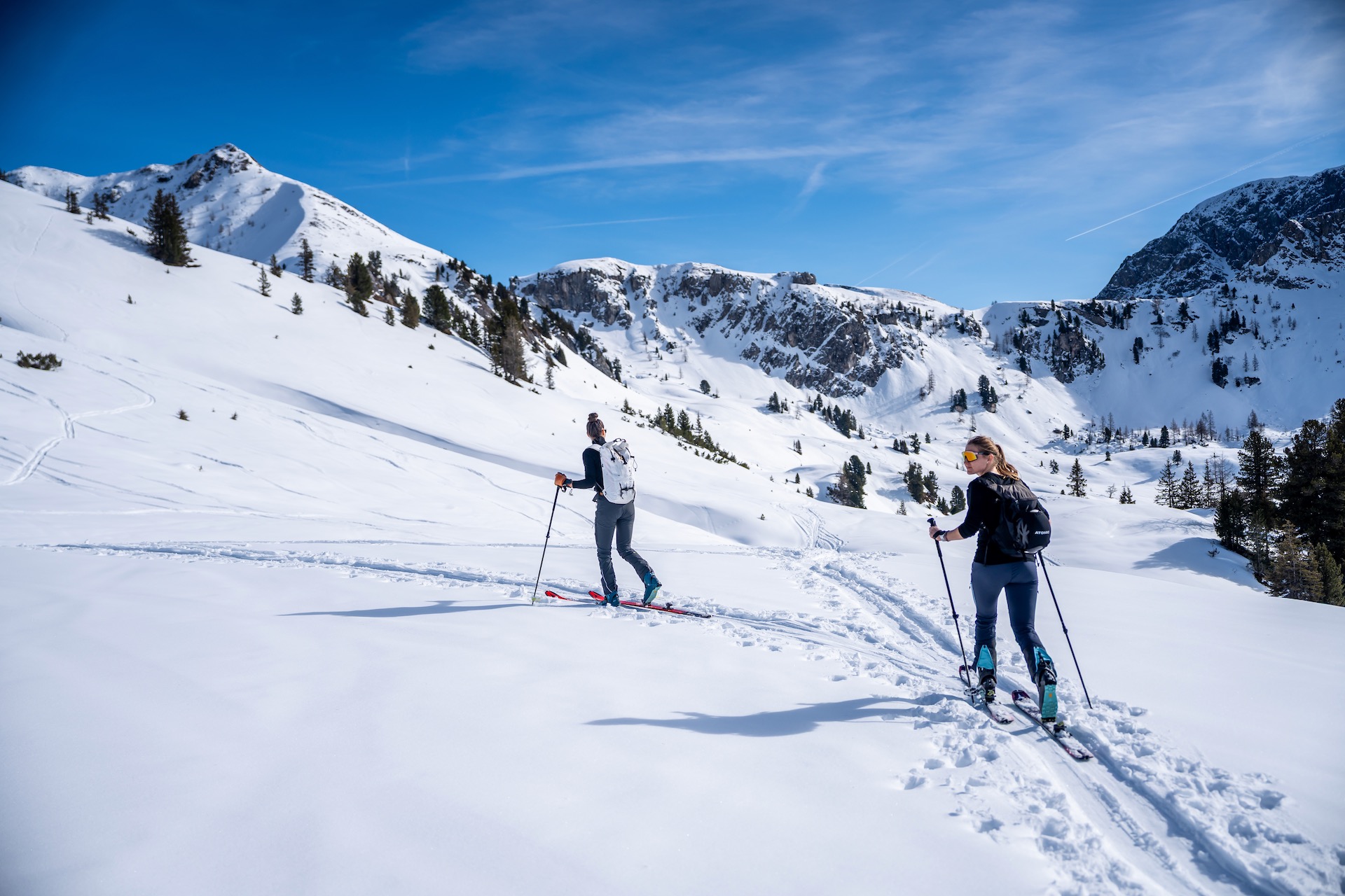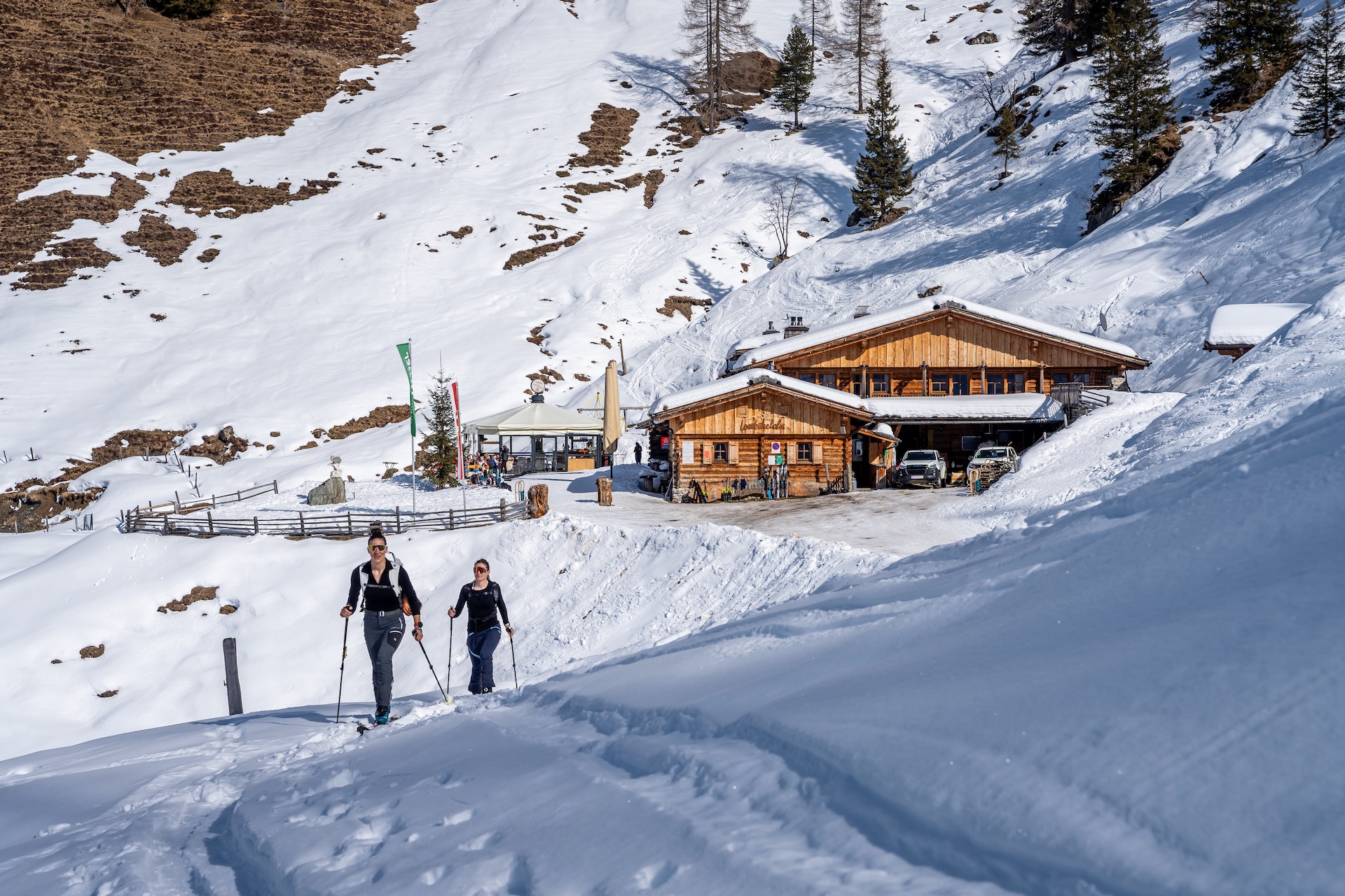 Im unteren Bereich bietet die Forststraße eine sichere Variante, besonders wenn die Schneelage bescheiden ist. Je näher gen Talboden desto mehr bündeln sich die Touren wieder, um am Ende am Parkplatz Grundlehen im Ellmautal zusammen zu kommen.