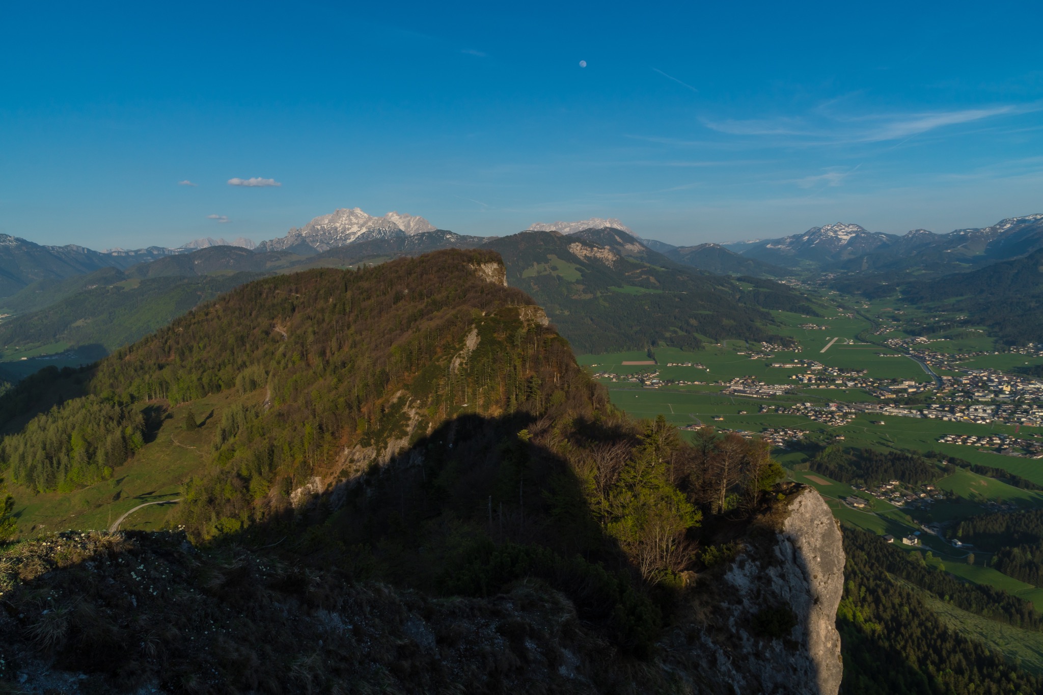 Immer wieder erlaubt er grandiose Ausblicke zum Wilden Kaiser, hinter den sich langsam die Sonne zu senken beginnt. Vor Erreichen des Labturkopfs (1.434 m) entfernt sich der Steig nun vom Kammverlauf hinab zur Einödalm. Der breite Forstweg führt hinauf zur Niederalm während die Chiemgauer Alpen und Loferer Steinberge im abendlichen Alpenglühen erstrahlen.